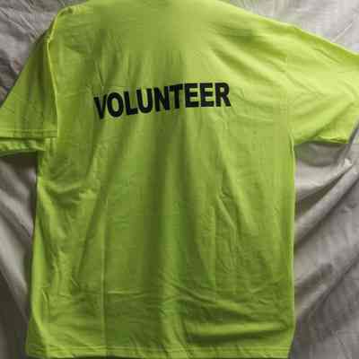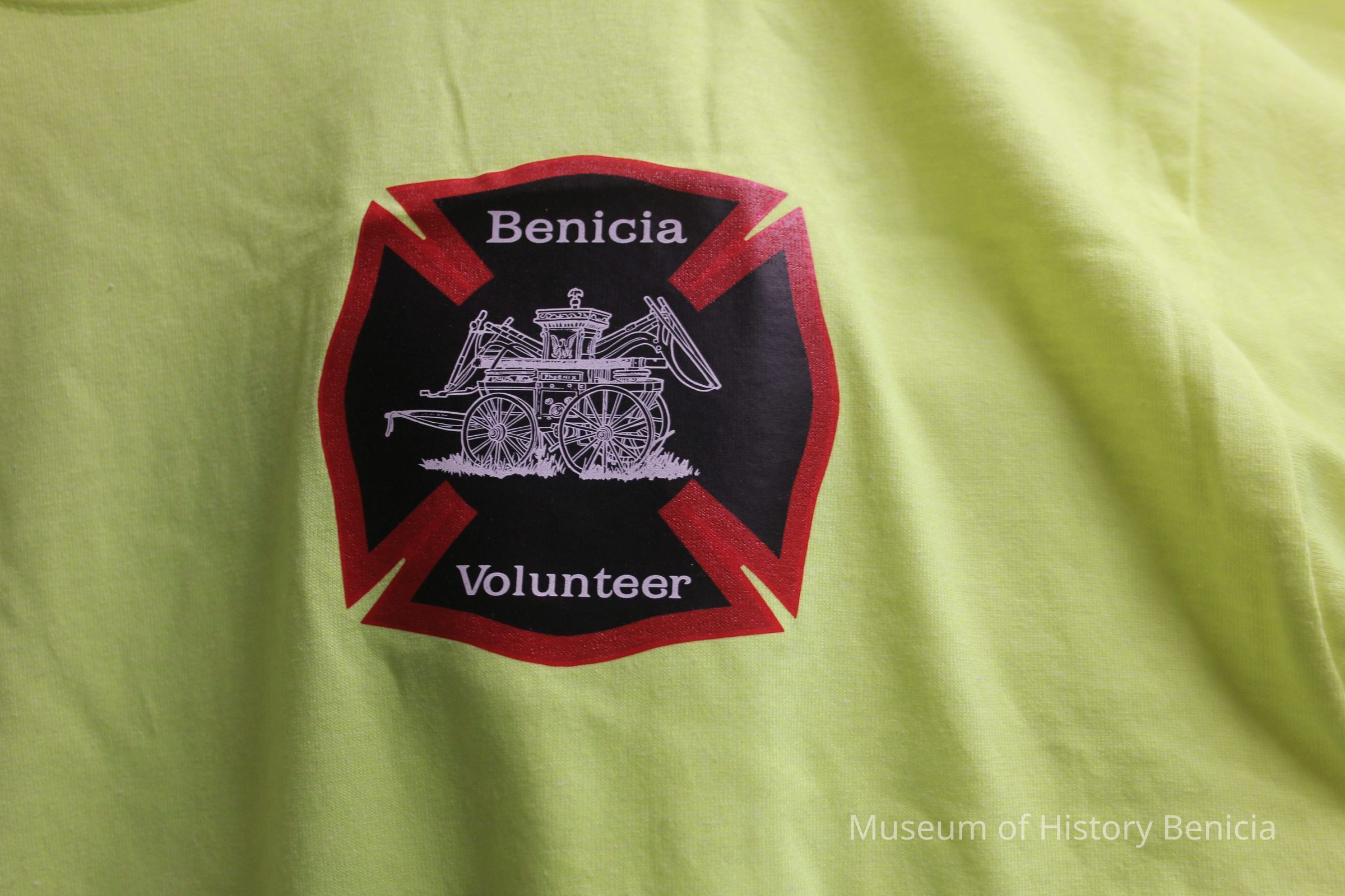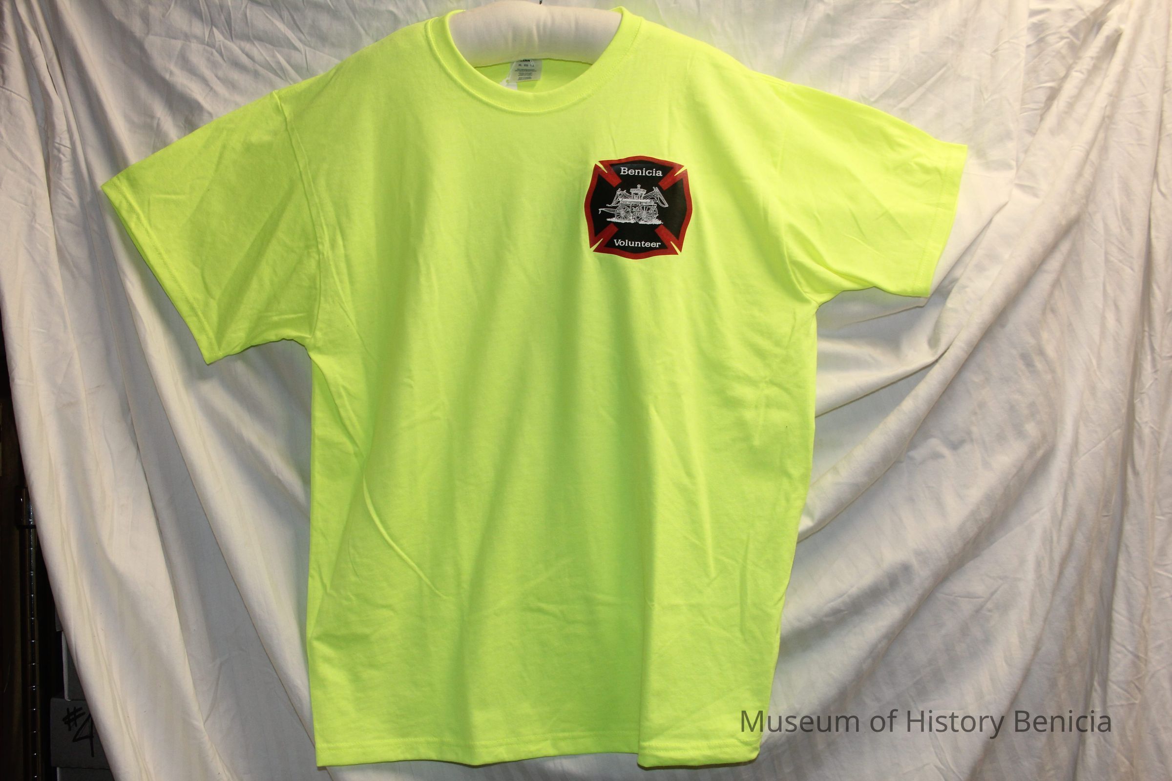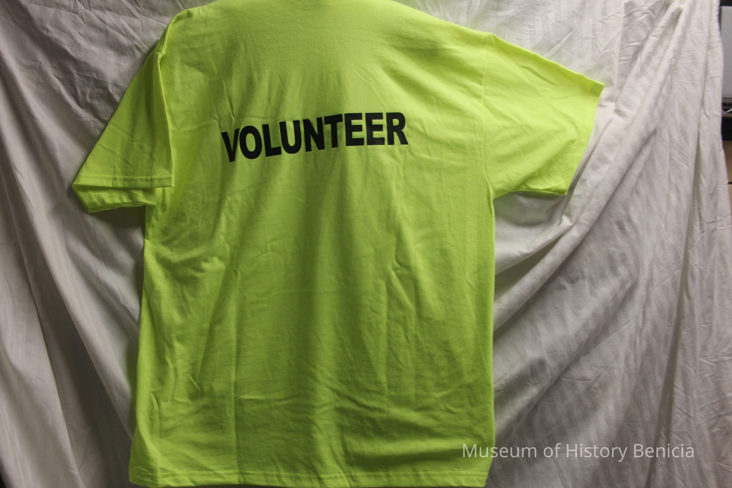 Short sleeved T-shirt, neon yellow-green, with "Benicia Volunteer" screenprint logo on front left and "Volunteer" screenprint in black block letters on reverse.