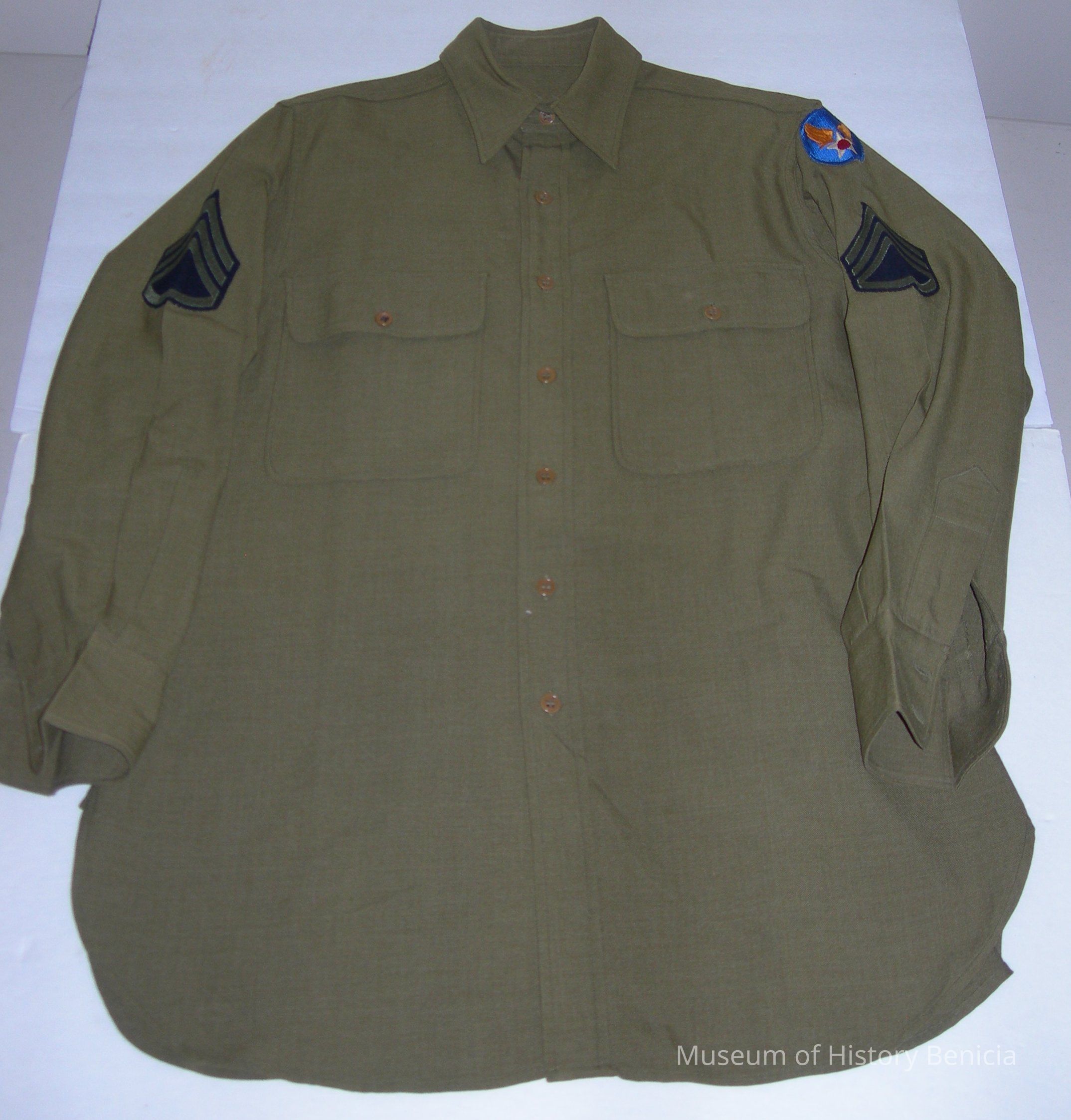 WWII U.S. Army Wool Shirt, long sleeved; olive green and is worn with a tunic;