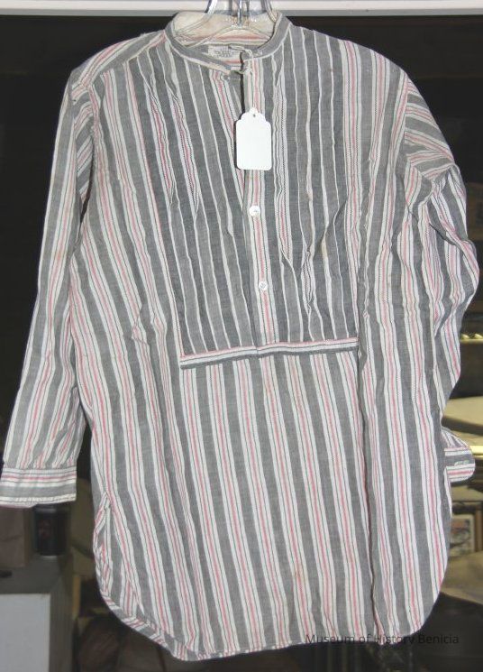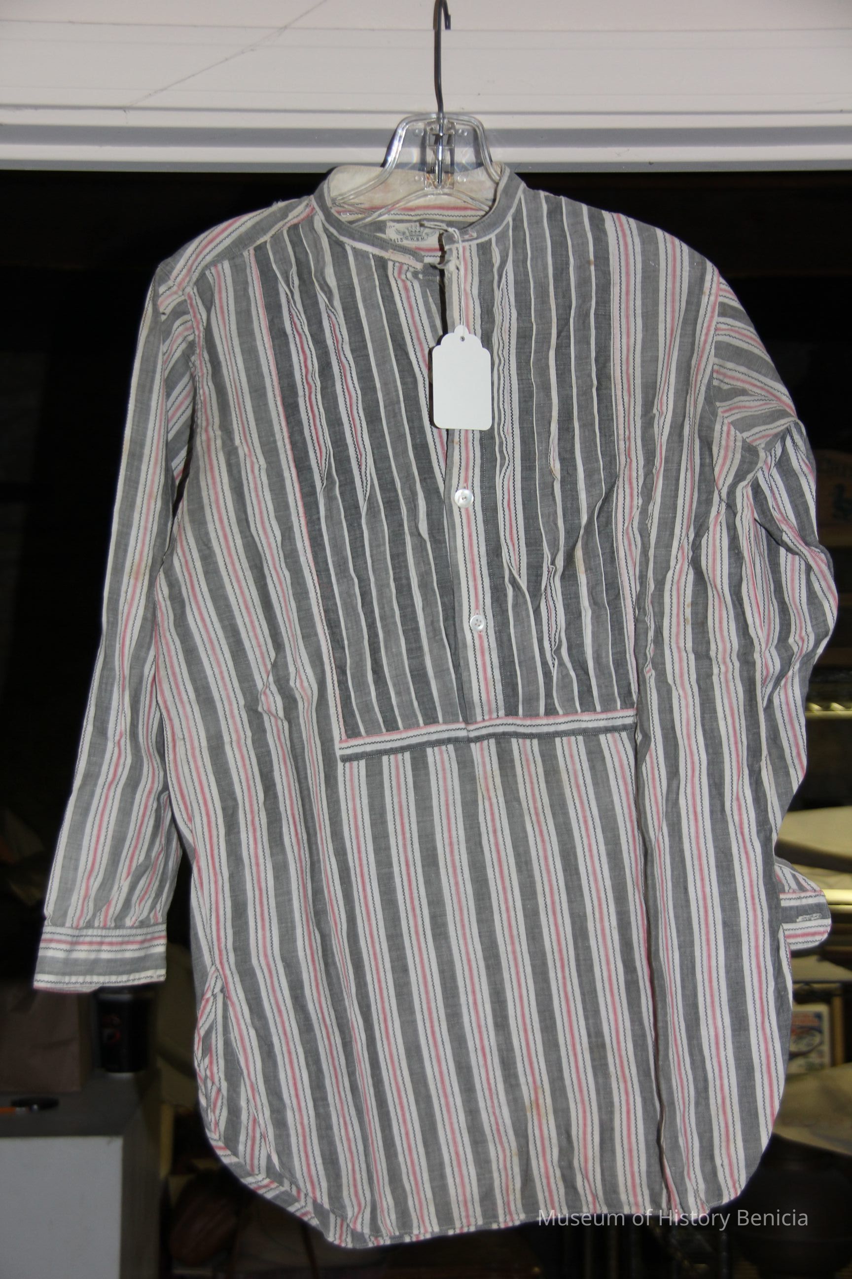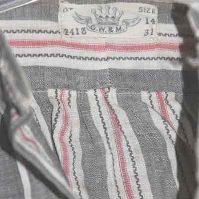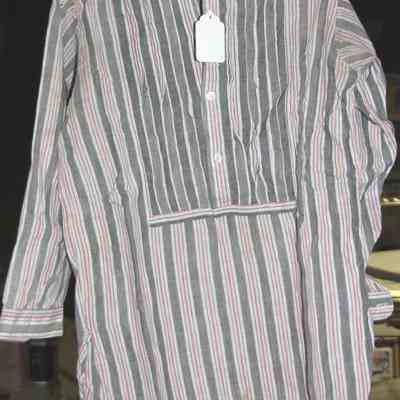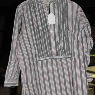 Black & Grey linen collarless shirt with pink stripes. 3 pleats on each side of front of shirt. mother of pearl buttons.