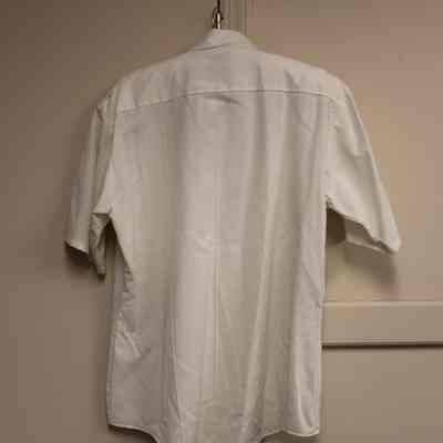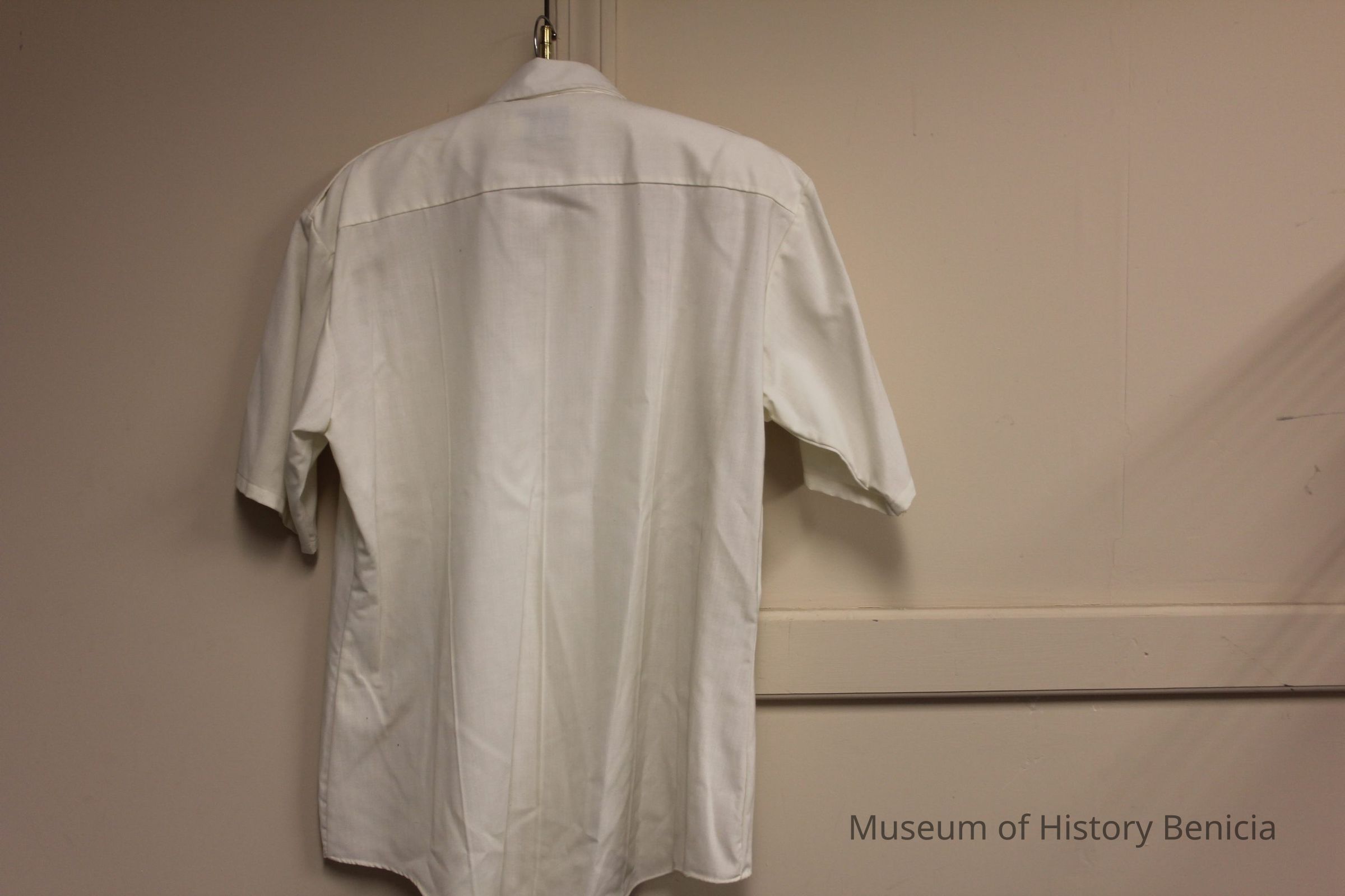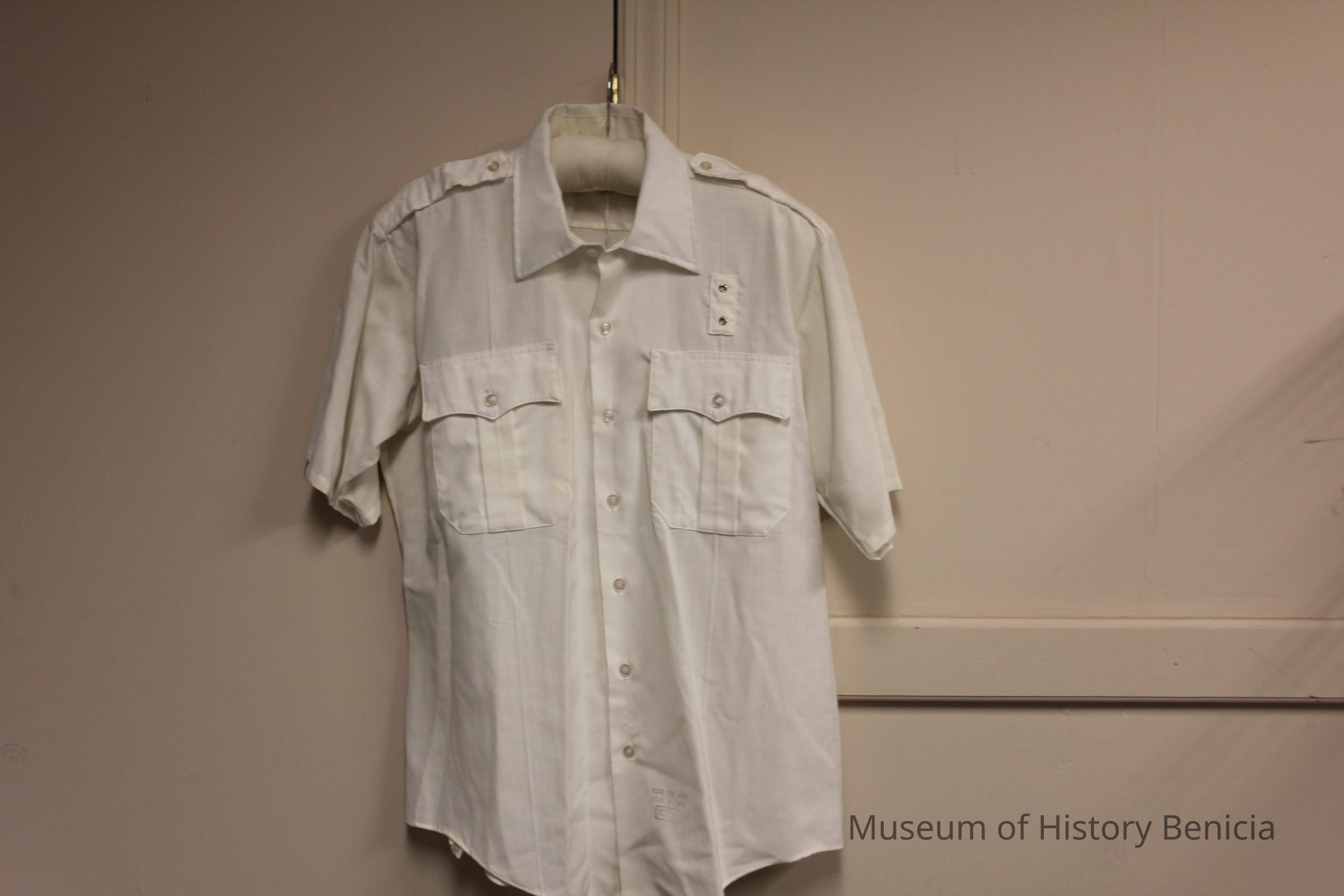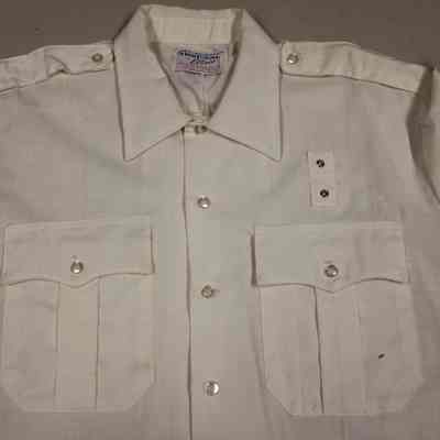 Short sleeve, white, size 16 1/2, firemen uniform shirt. Made of rayon and polyester; brand is Special Duty TROPICAL by Elbeco. Has two self-fabric patch breast pockets and epaulets. There are two metal grommets above the left pocket assumed to be a badge holder. Unsure if this was volunteer or regular firemen's shirt. No decorative patches.Collection