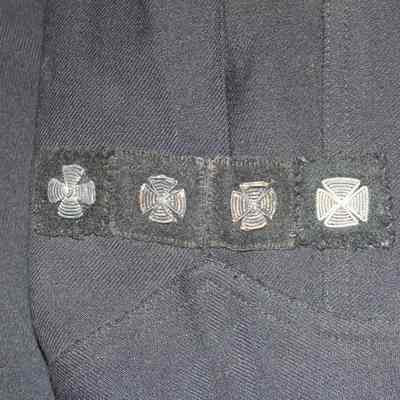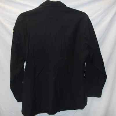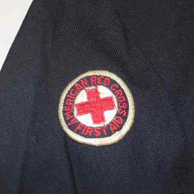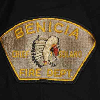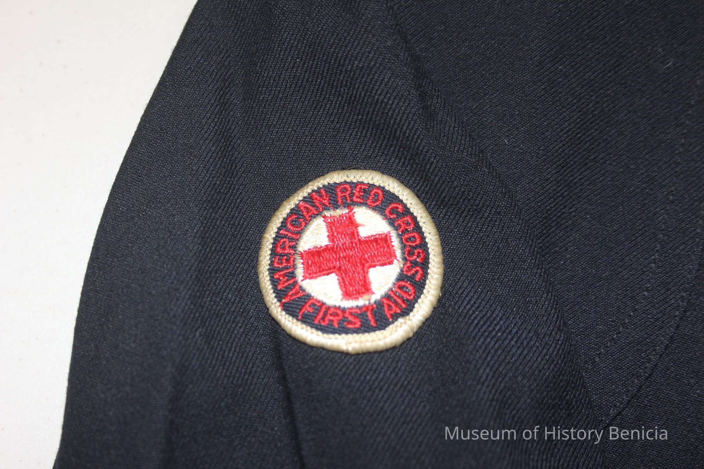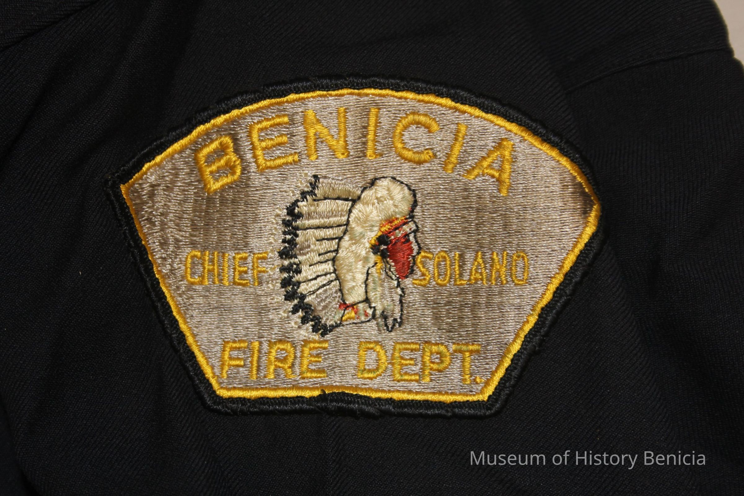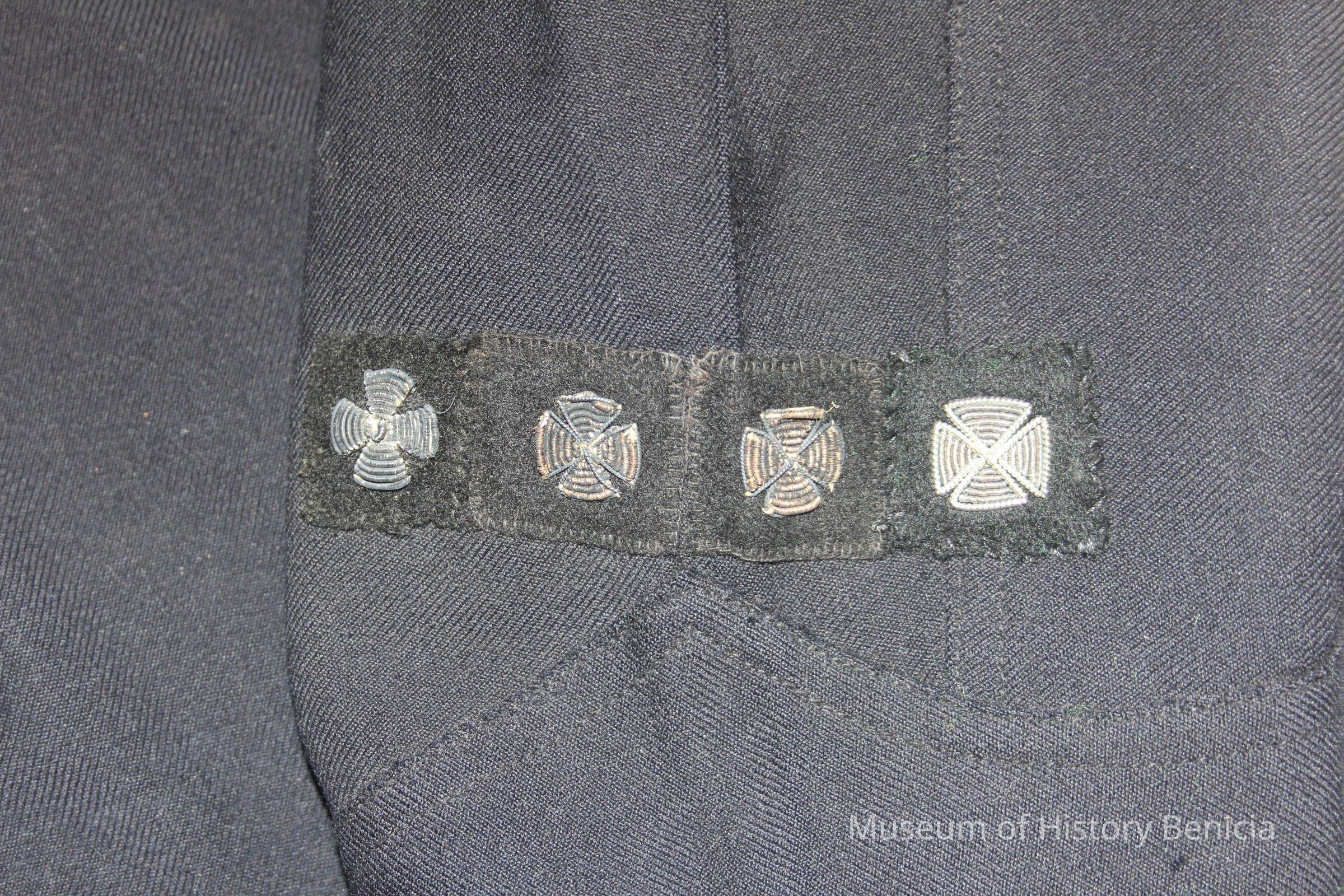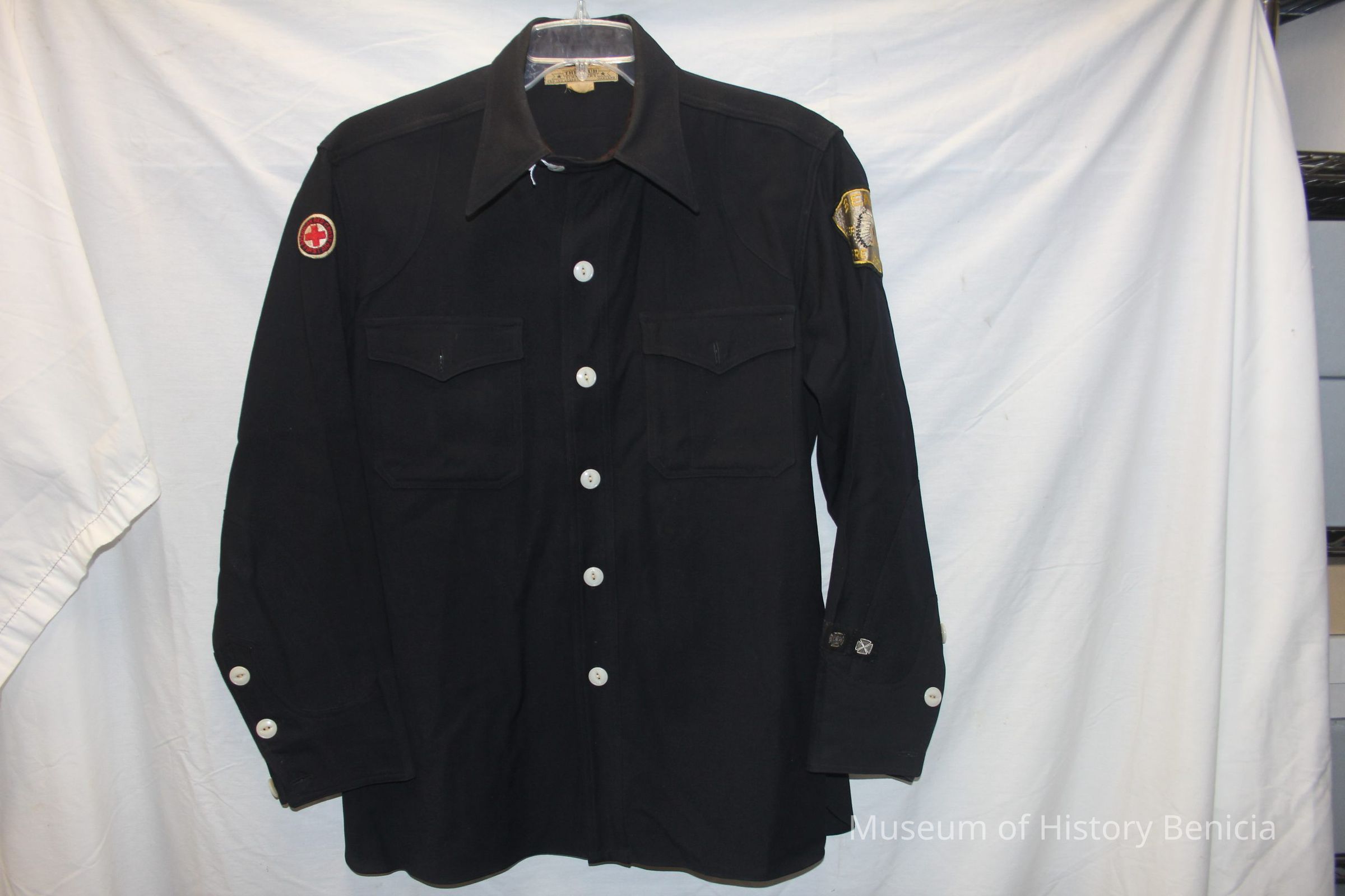 Long sleeve, dark blue, Benicia volunteer firemen uniform shirt. Assumed 100% wool twill made/sold as The HUB by Schneider's. Has two self=fabric patch breast pockets and epaulets. American Red Cross First Aid patch on right shoulder; Chief Solano patch on left shoulder. Four 1" fire insignia sewn on the left cuff.Collection