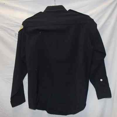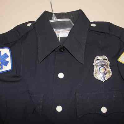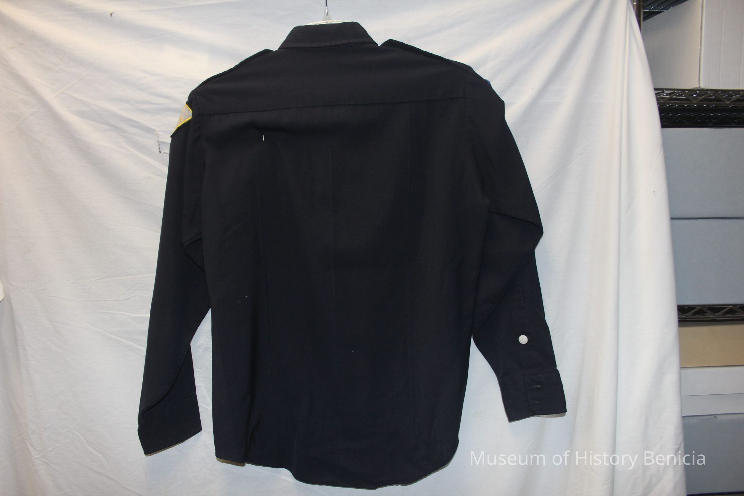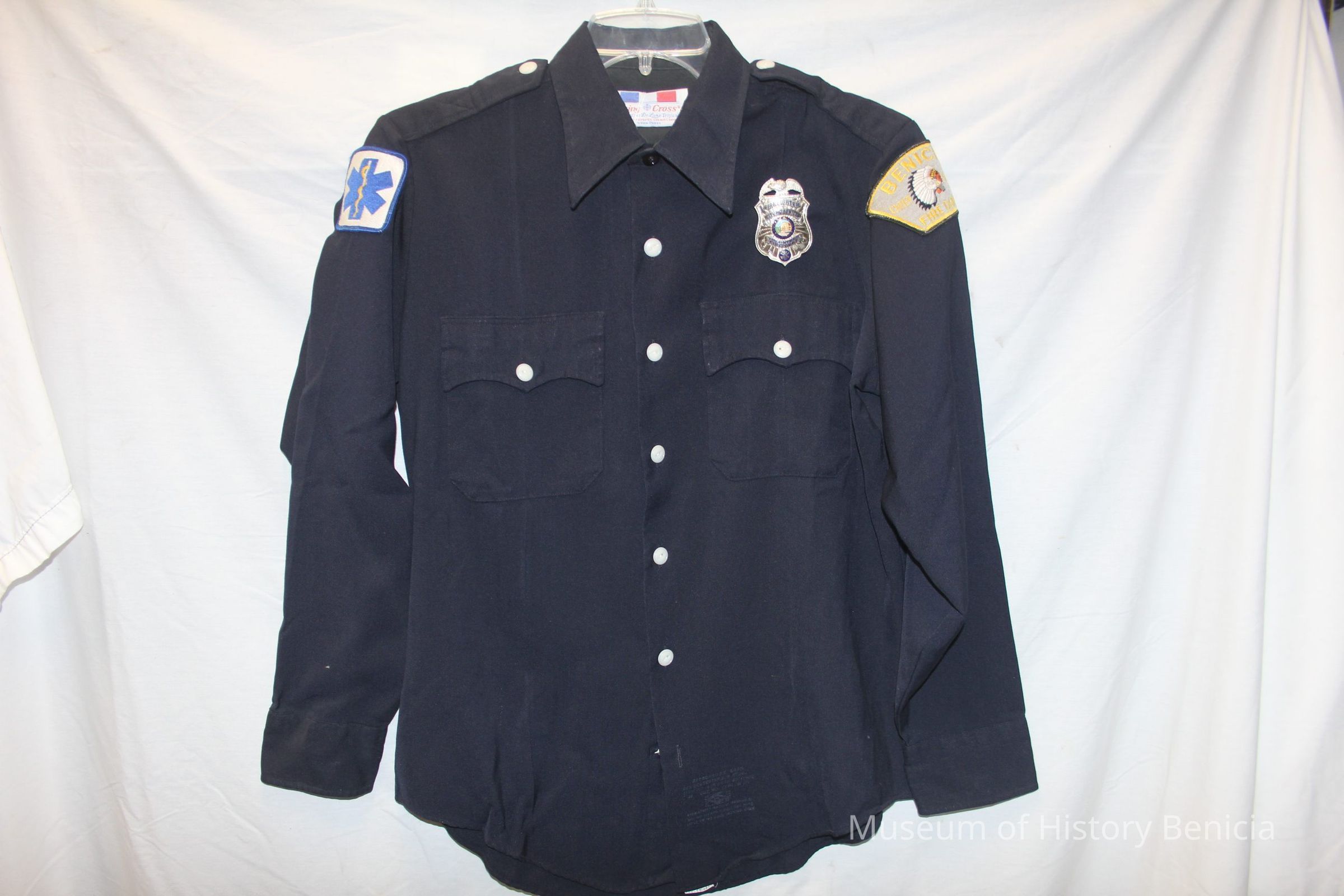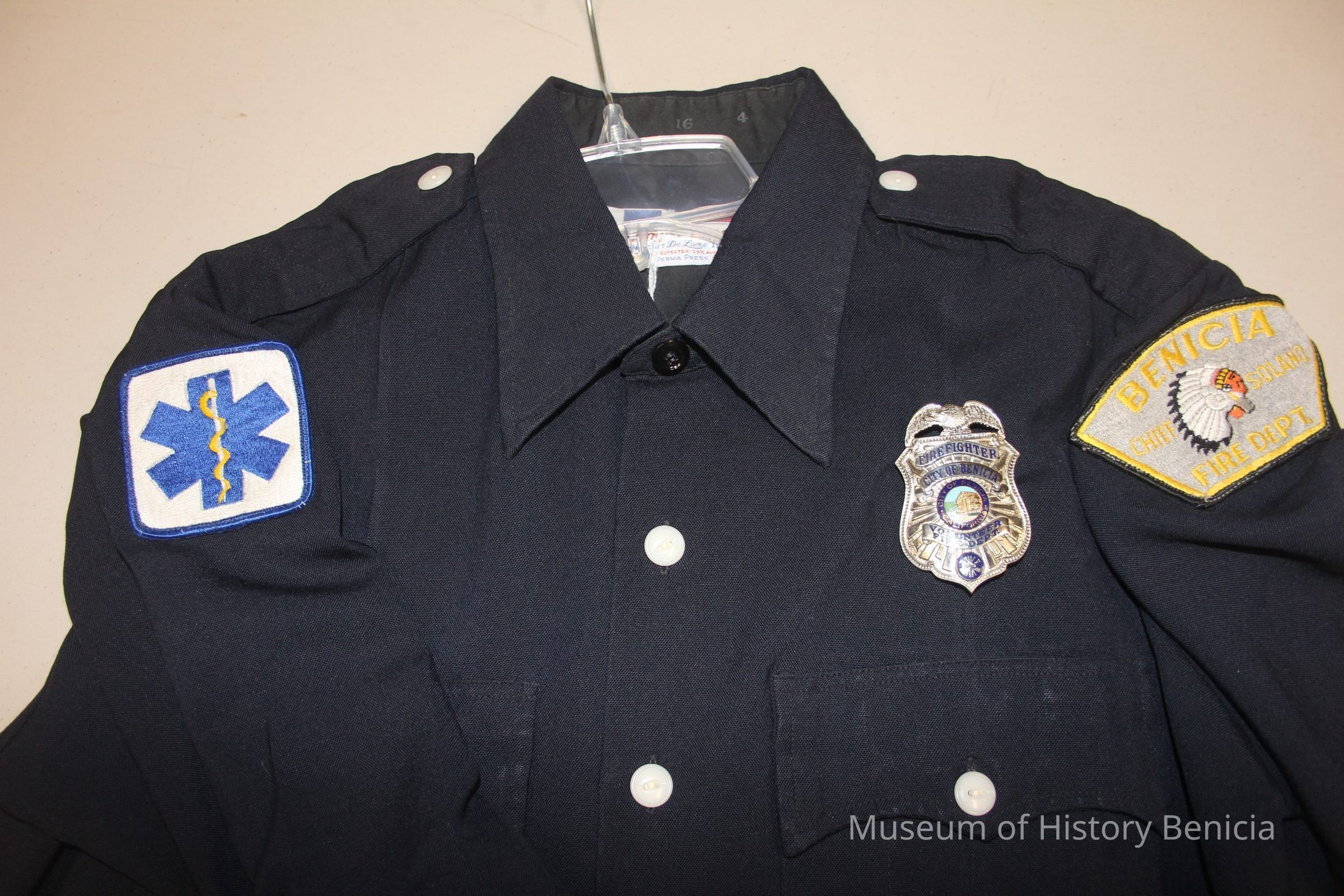 Long sleeve, dark blue, Benicia volunteer firemen uniform shirt. Made of rayon and Dacron polyester twill by Flying Cross company. Has two self=fabric patch breast pockets and epaulets. EMT patch on right shoulder; Chief Solano patch on left shoulder. Silver-tone metal Volunteer Fire Department badge pinned to front (2022.6.13.6.3b)Collection