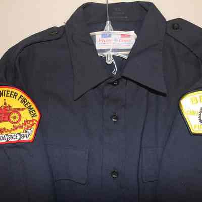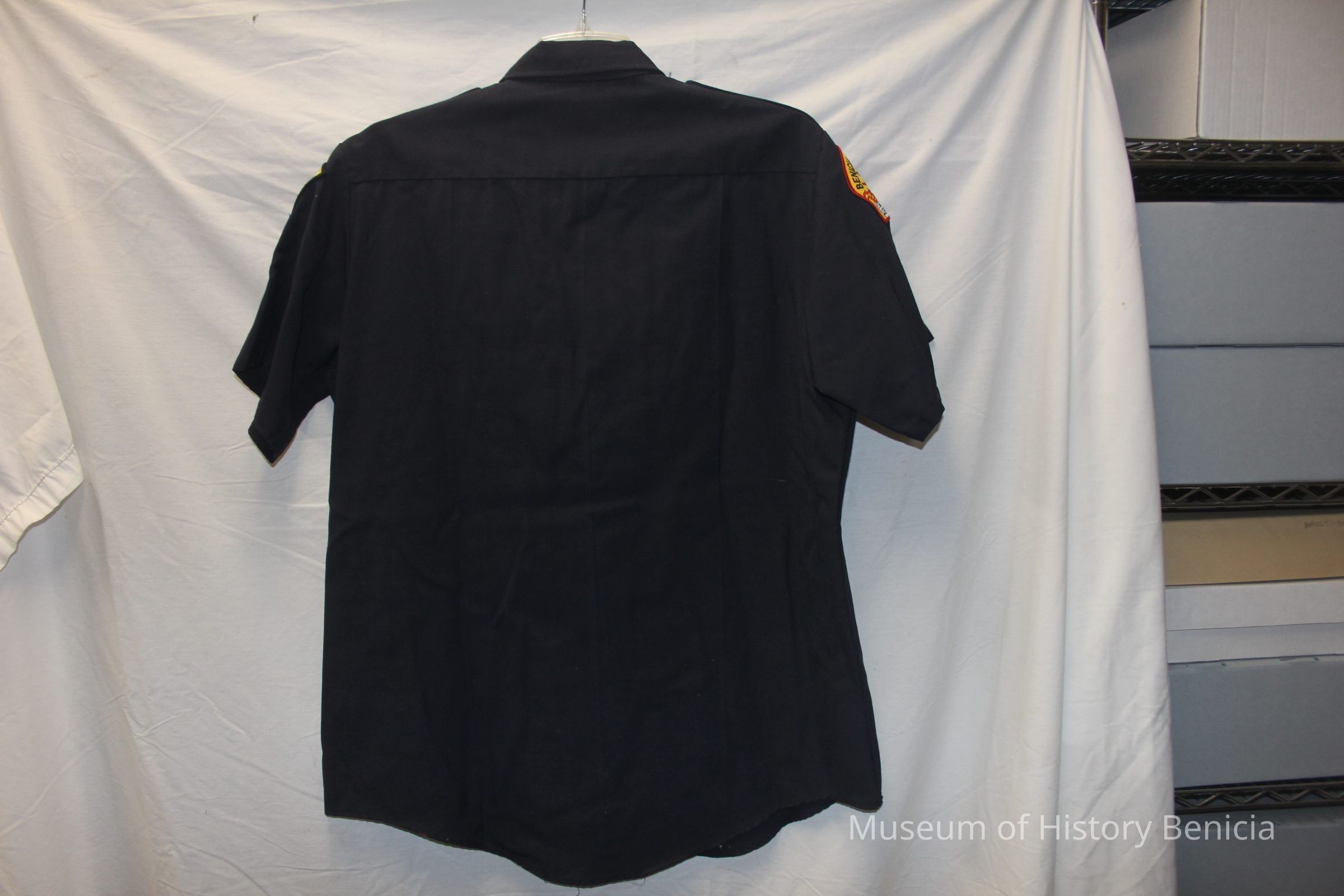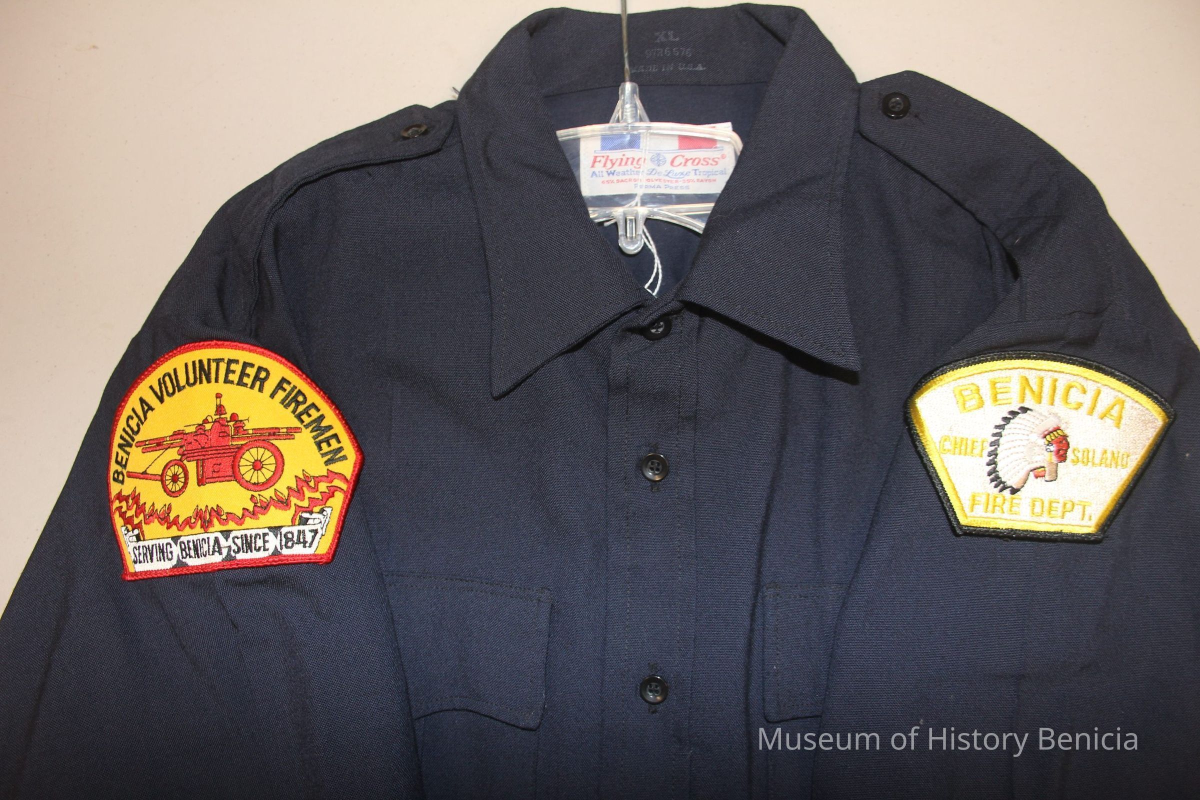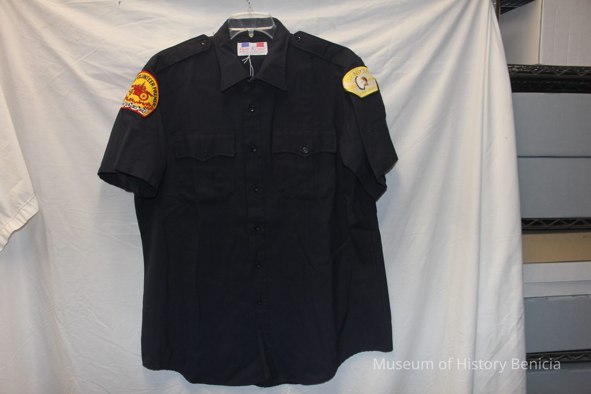 Short sleeve, dark blue, size XL, Benicia volunteer firemen uniform shirt. Made of rayon and Dacron polyester twill by Flying Cross company. Has two self=fabric patch breast pockets and epaulets. Volunteer firemen patch on right shoulder; Chief Solano patch on left shoulder.Collection