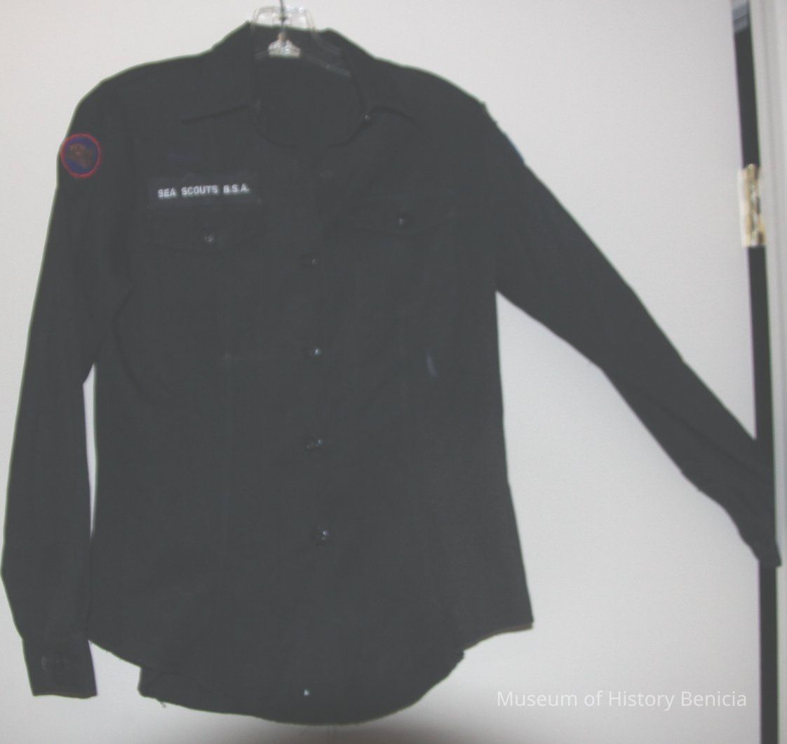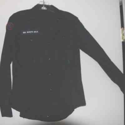 Dark blue six button front style shirt/uniform top; long sleeves; two breast pockets with buttons, embroidered patch above right pocket "SEA SCOUTS B.S.A."; all buttons have anchor impressions