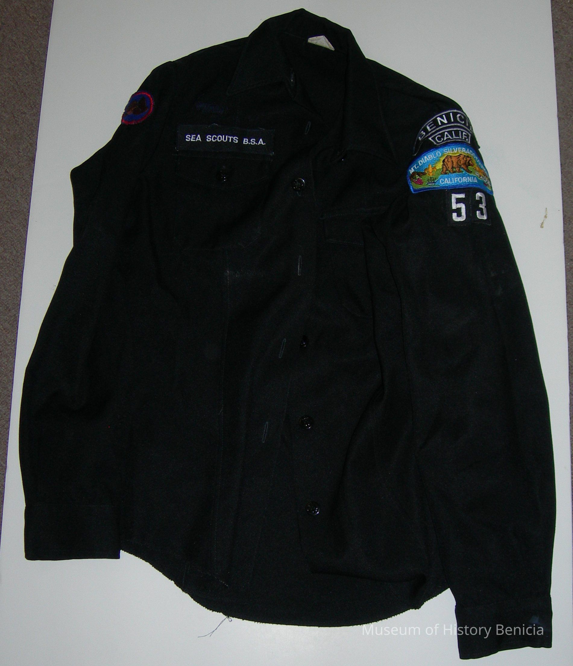 left sleeve embroidered patches: 1. BENICIA, 2. CALIF. 3. MT DIABLO SILVERADO COUNCIL CALIFORNIA with a grizzly bear and other symbols of the area, 4. 53
