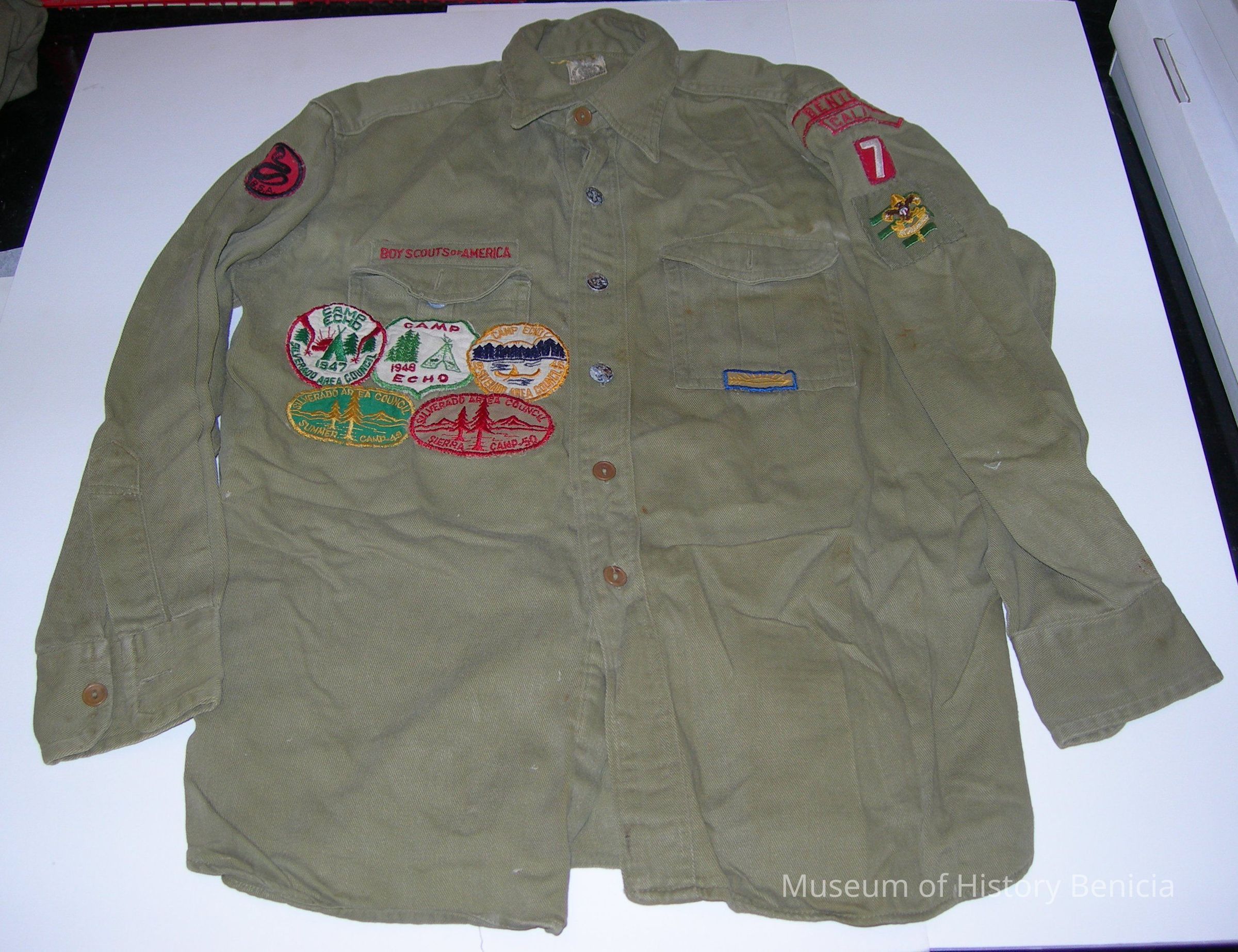 Left sleeve: "Benicia" "Calif", white "7" on a red rectangle, Boy Scout insignia in green, gold, brown
