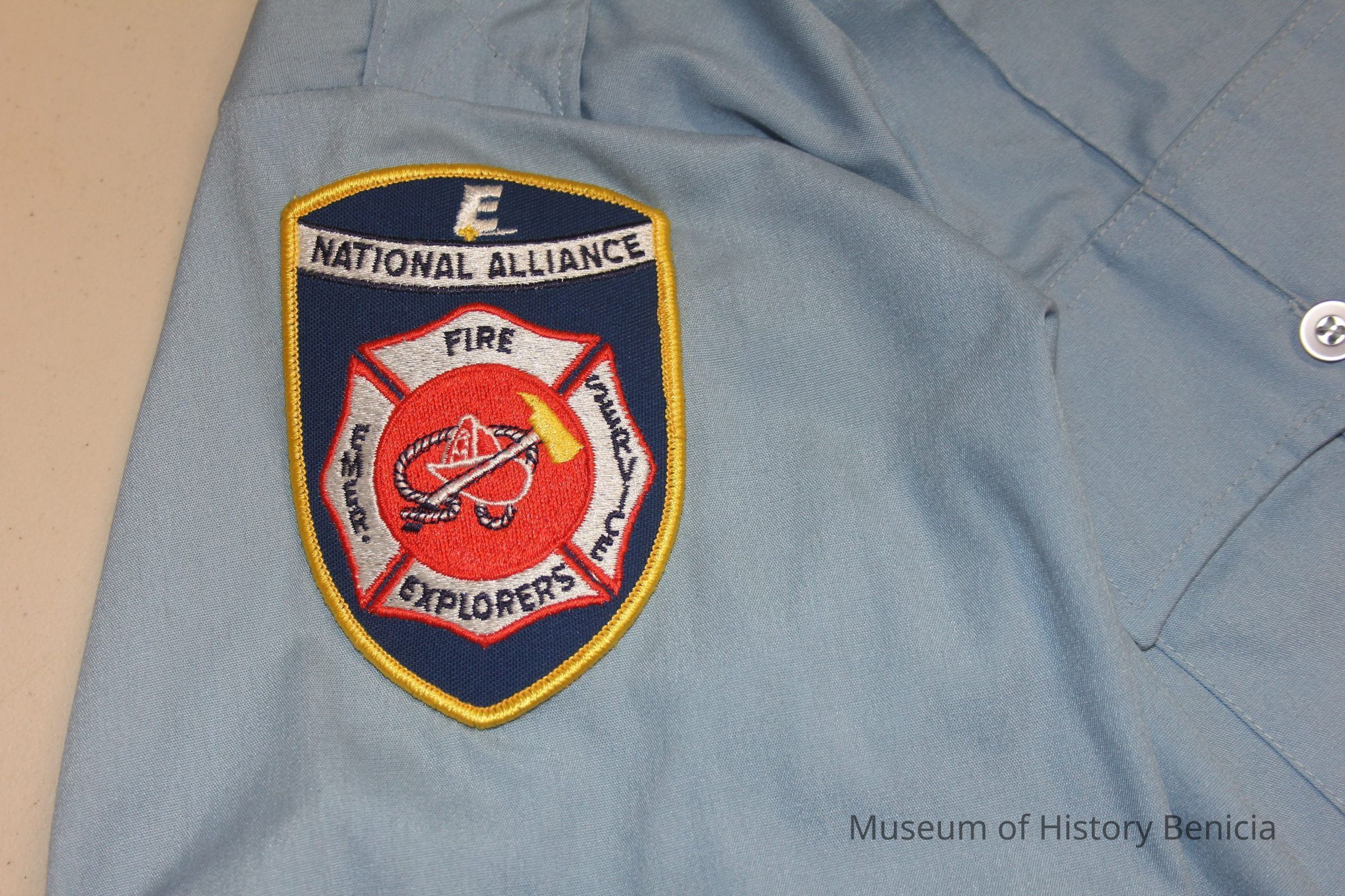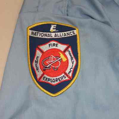 Long-sleeved, button down Fire Explorers uniform shirt. Light blue, (assumed) polyester blend sold by "GALLS Gear". Shirt has National Alliance Explorer patch on right sleeve. Front of shirt has two batch pockets at breast level.Collection