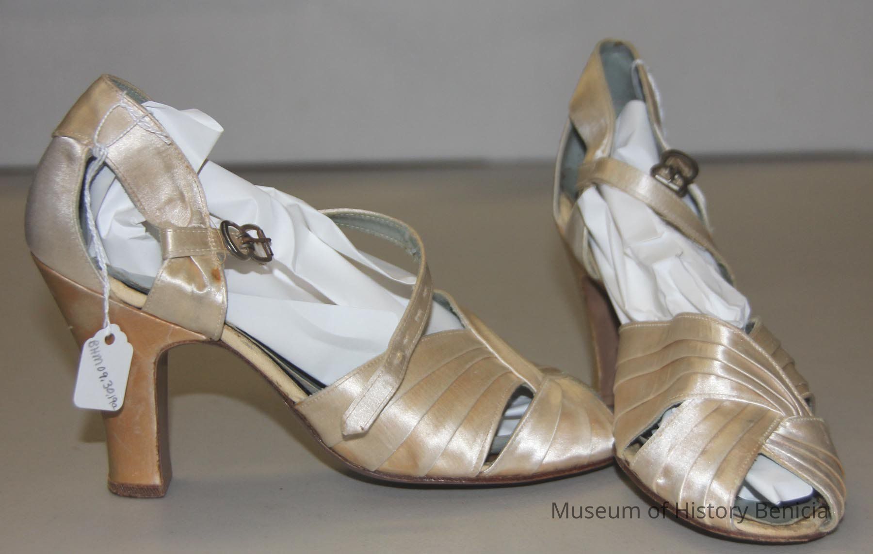 shoes, wedding heels (3" hight) open toed, off white, light blue lining, strap with buckle across ankle. These shoes were worn by Mrs. Kenneth Nunn for her wedding to Kenneth Nunn of Benicia.