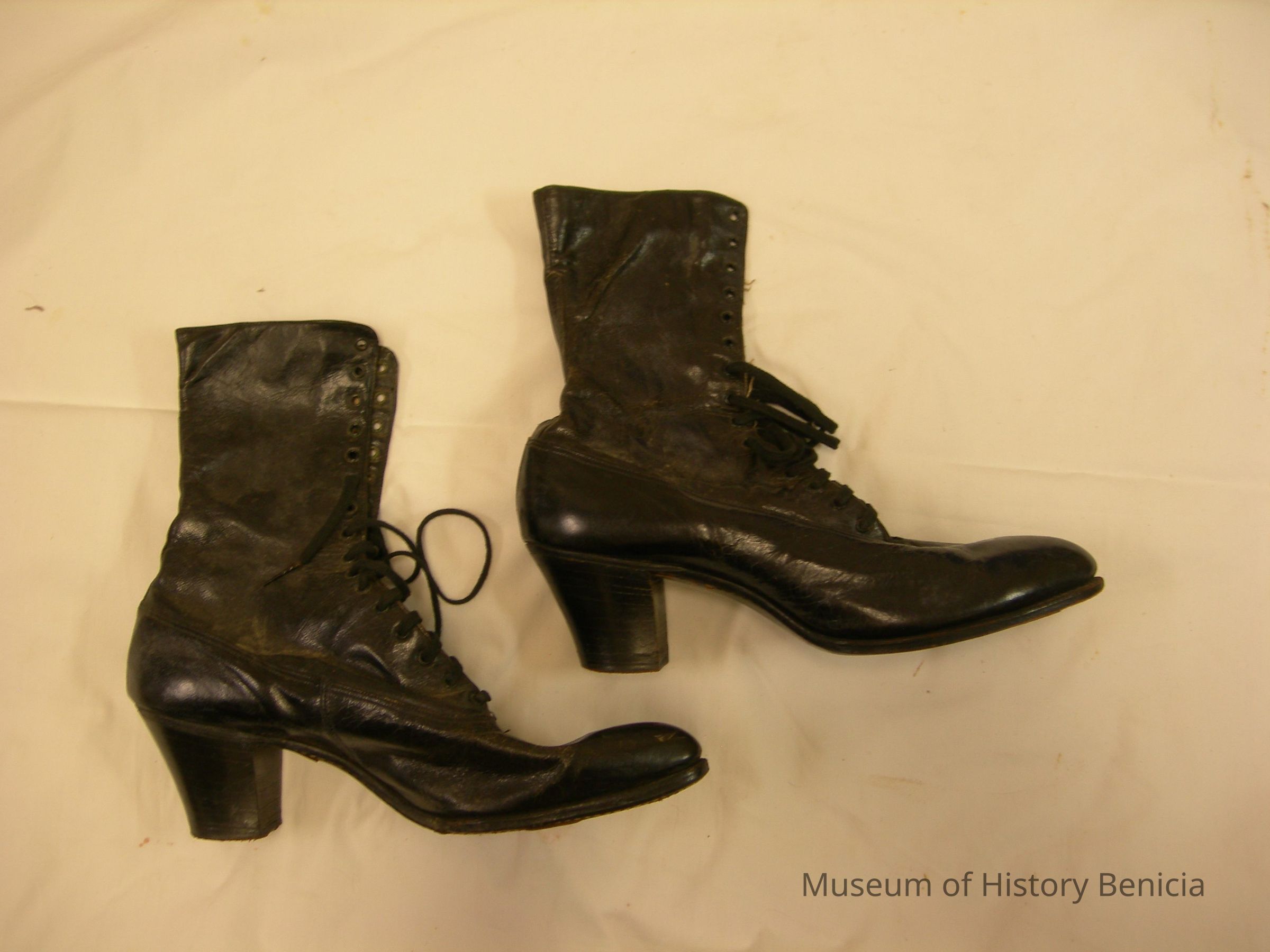 Pair of black over-the-ankle, women's leather shoes, lace-up; 2" heels; circa 1900 Left shoe: 2018.005.0001a Right shoe: 2018.005.0001b