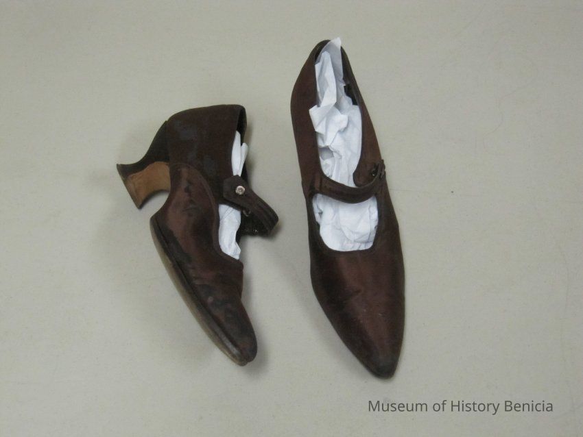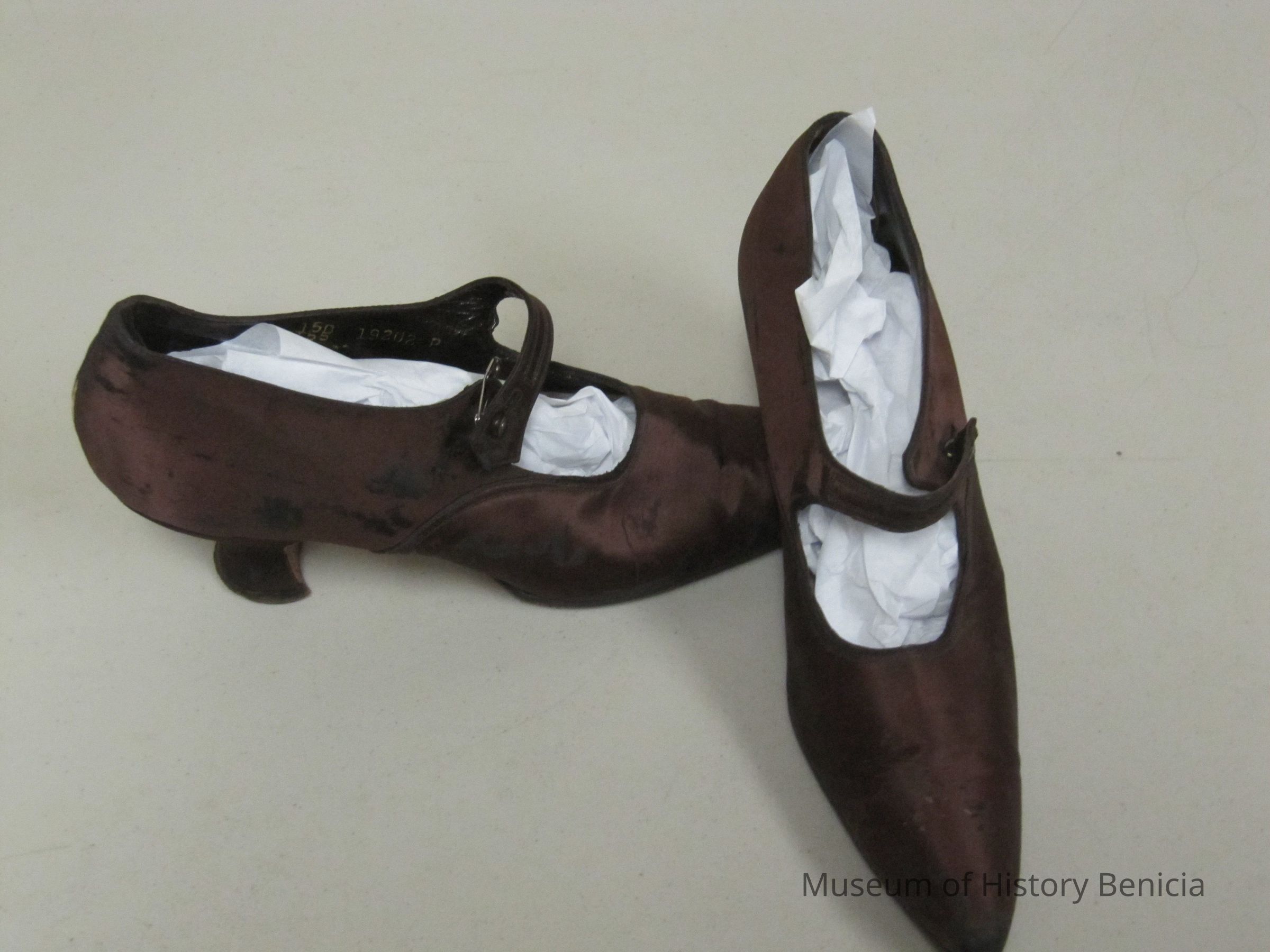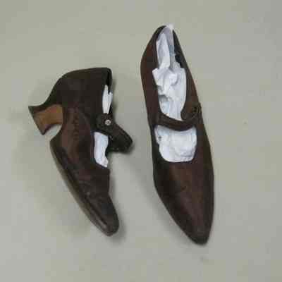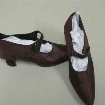 Pair of brown satin high-heel shoes. Each shoe has a strap with a button.