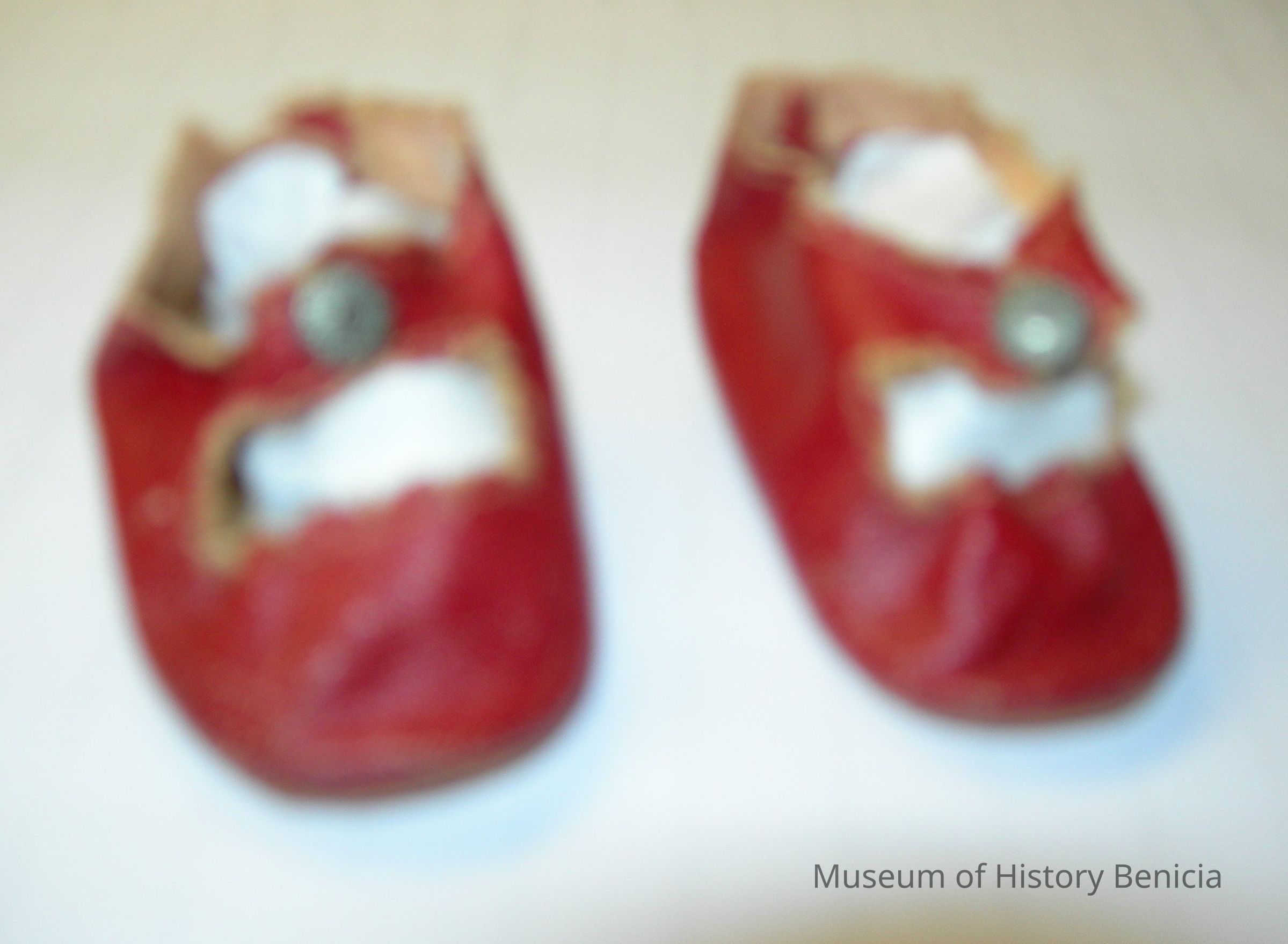 doll shoes - red faux leather, snap strap closure BHM2009.030.0050a = one shoe shoes are not molded for right or left BHM2009.030.0050b = other shoe