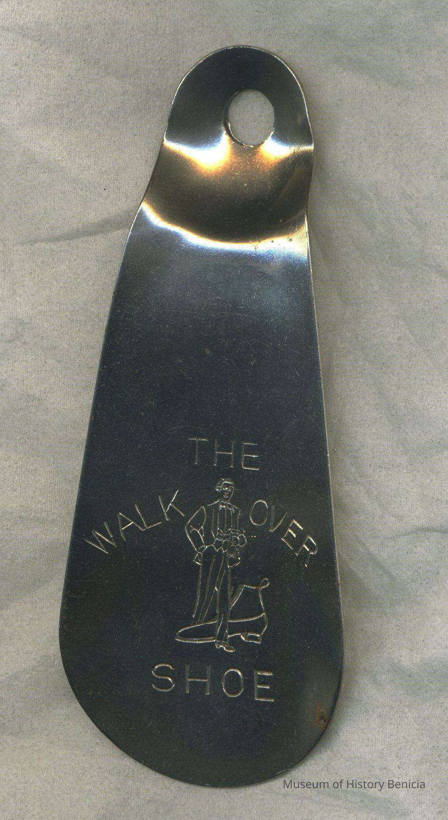 Shoehorn - nickel-plated metal with "The Walk Over Shoe" stamped on front curved part; has a hole in the handle and "Sommer's Pat. 12.16.13" stamped on the back;