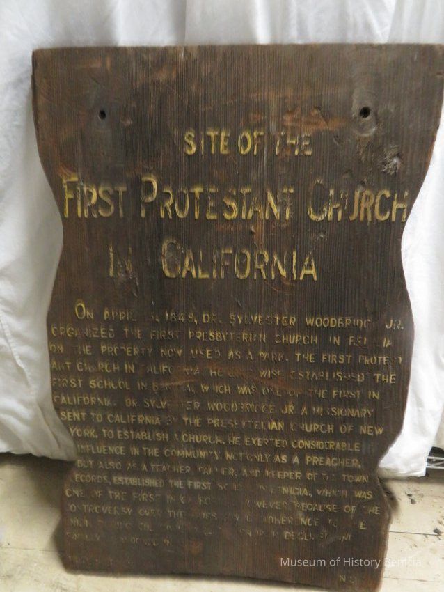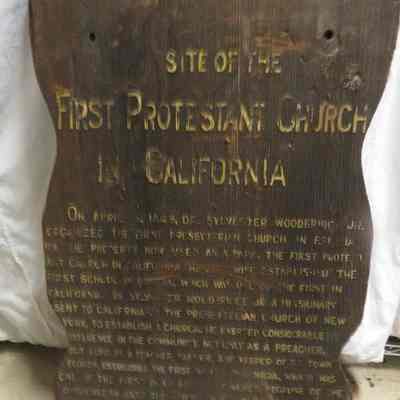 Historical landmark sign for the First Protestant Church in California with yellow print. Protestant Church was located where the City Park is today.Collection