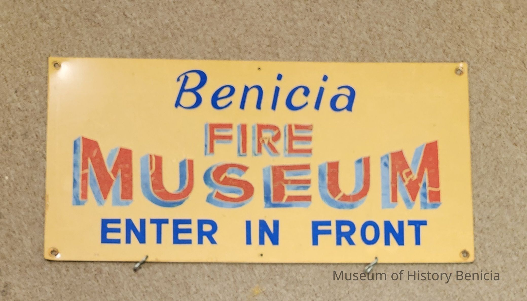 Metal sign with a hole in each corner for mounting to a wall; two "S" hooks on the bottom to hang an auxiliary sign (perhaps open/closed ?); red and blue lettering on a dark mustard-color backgroundCollection