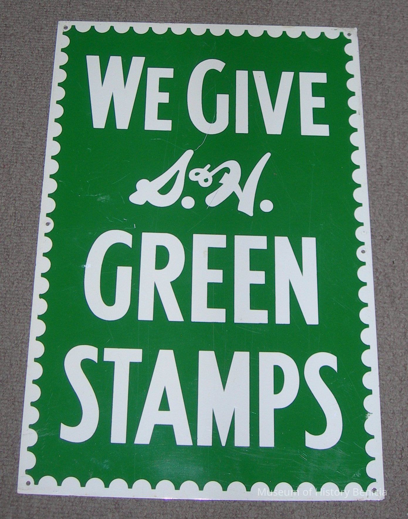 Advertising sign - "We give S.&H. Green Stamps" 11-3/4" x 18" - white lettering on green background