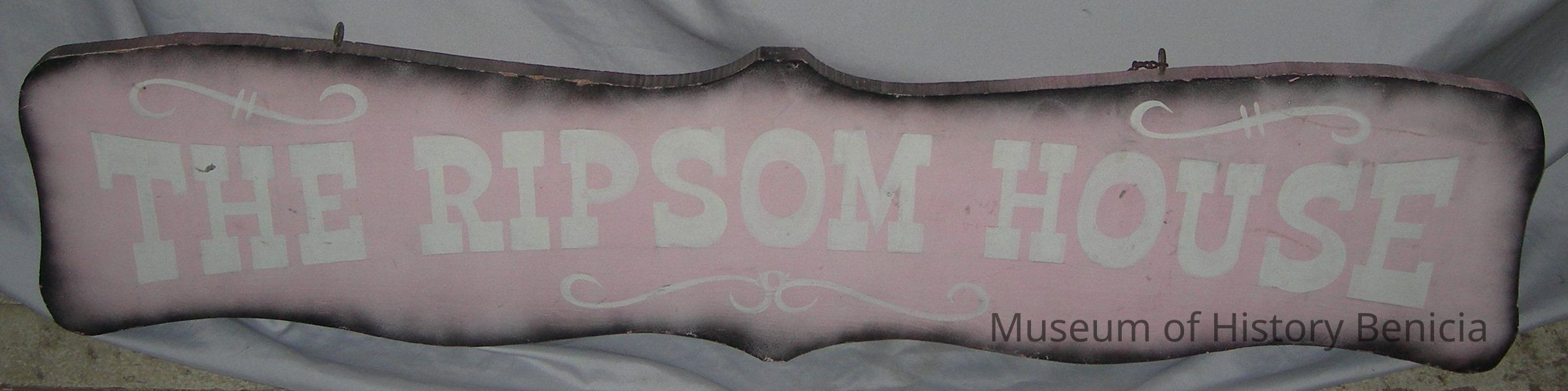 Sign - "The Ripsom House" white lettering on a pink background, one sided, some scalloping on the edges, 11" x 48"