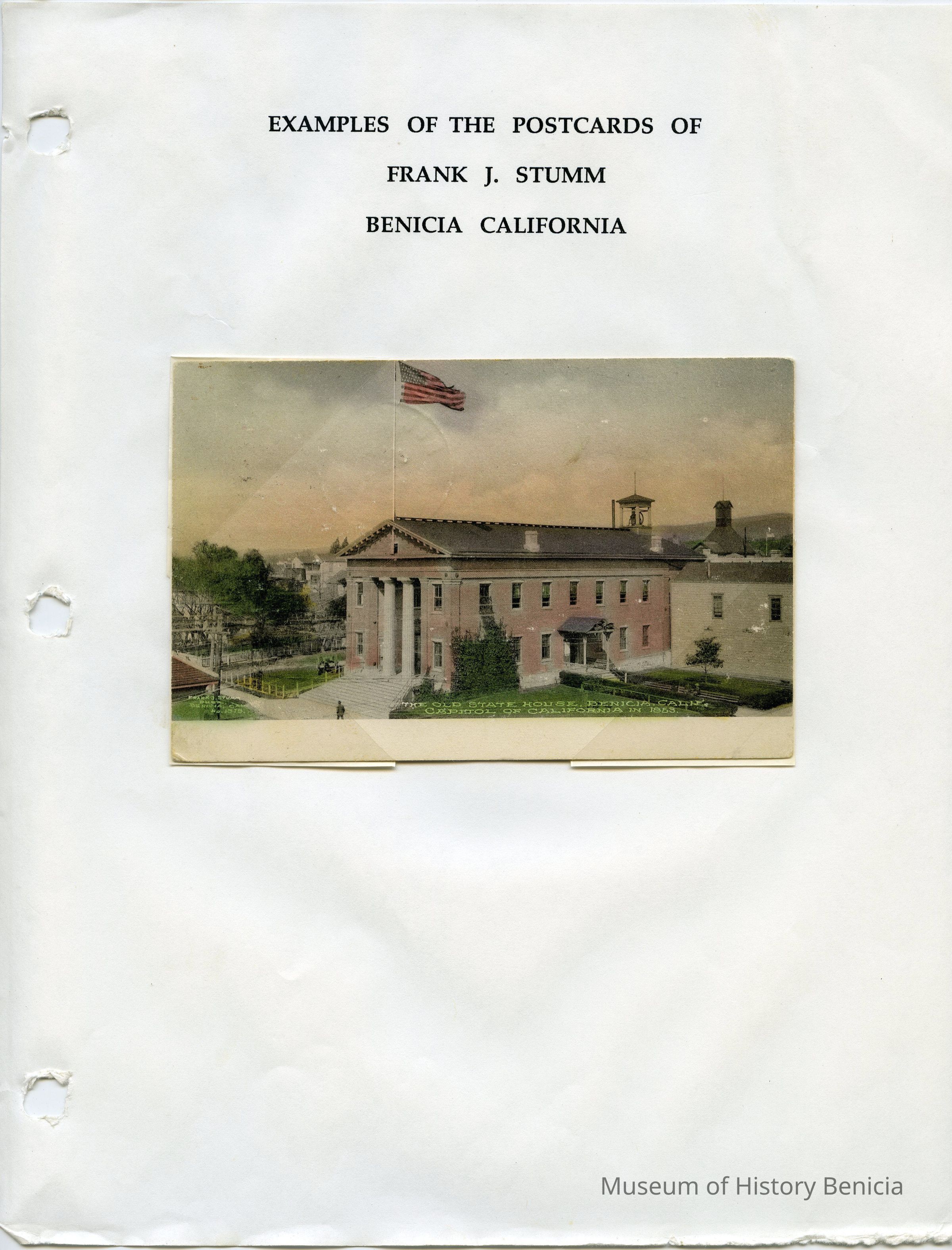 This is a printed page announcing "Examples of the Postcards of Frank J. Stumm Benicia Californis". There is then an example of one of Stumms postcards attached to the sign.Collection