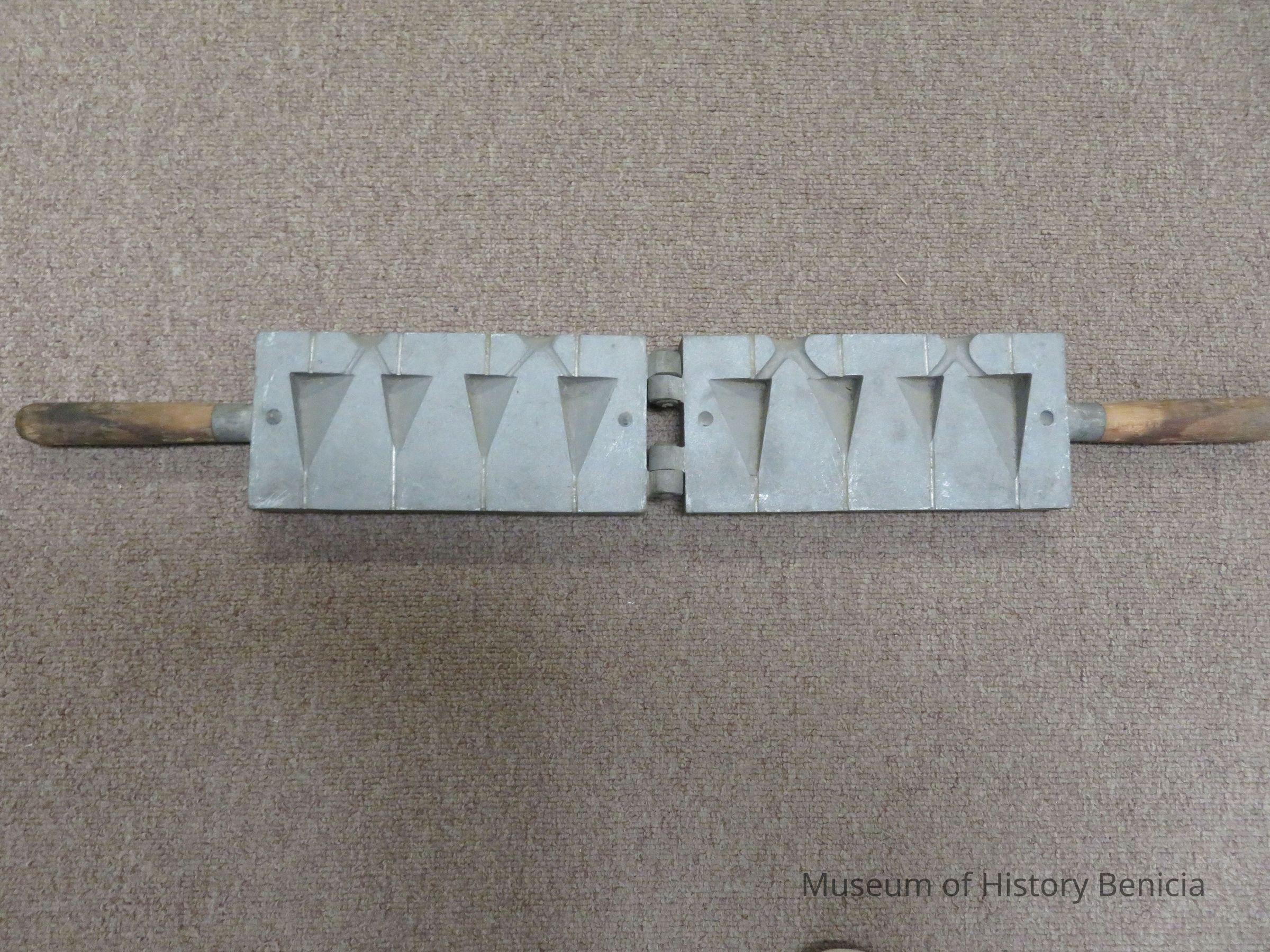 Metal mold with wood handles used to make homemade sinker weights for fishing line.