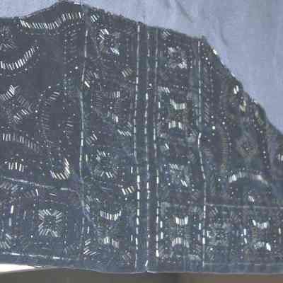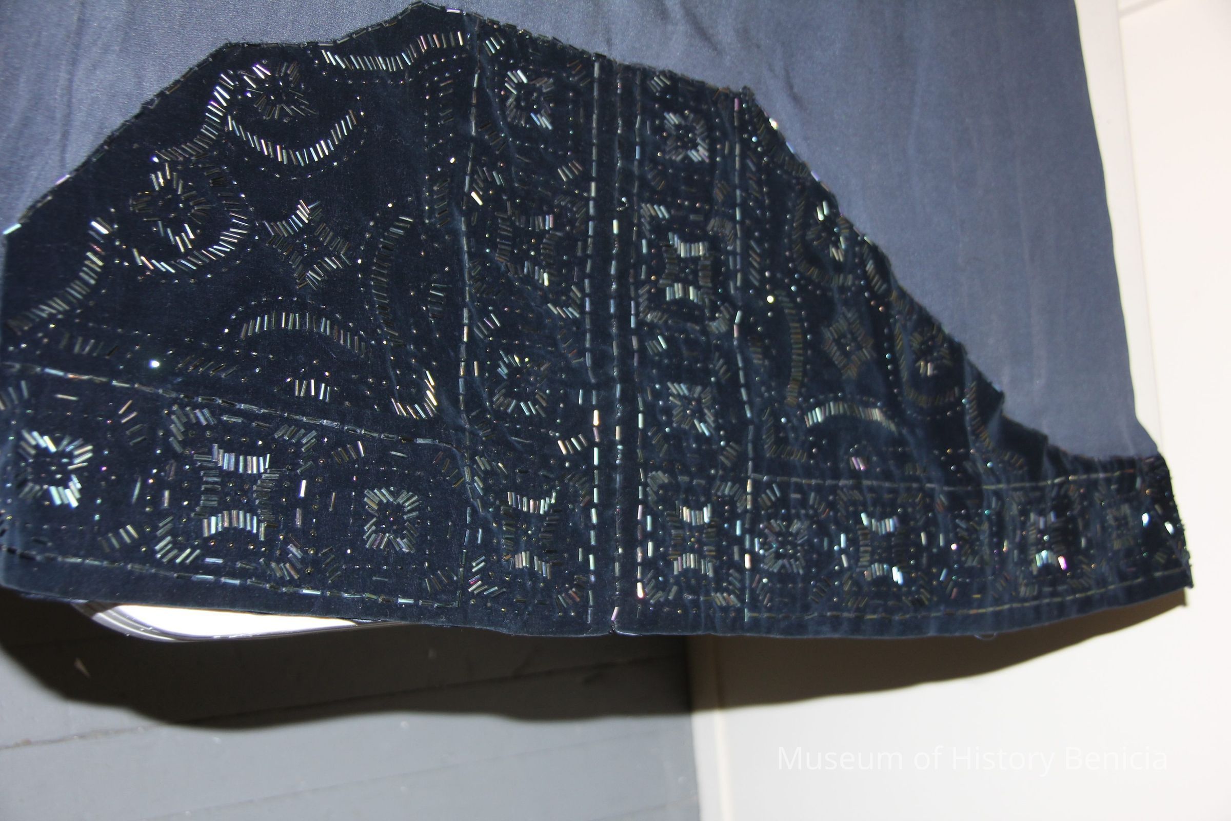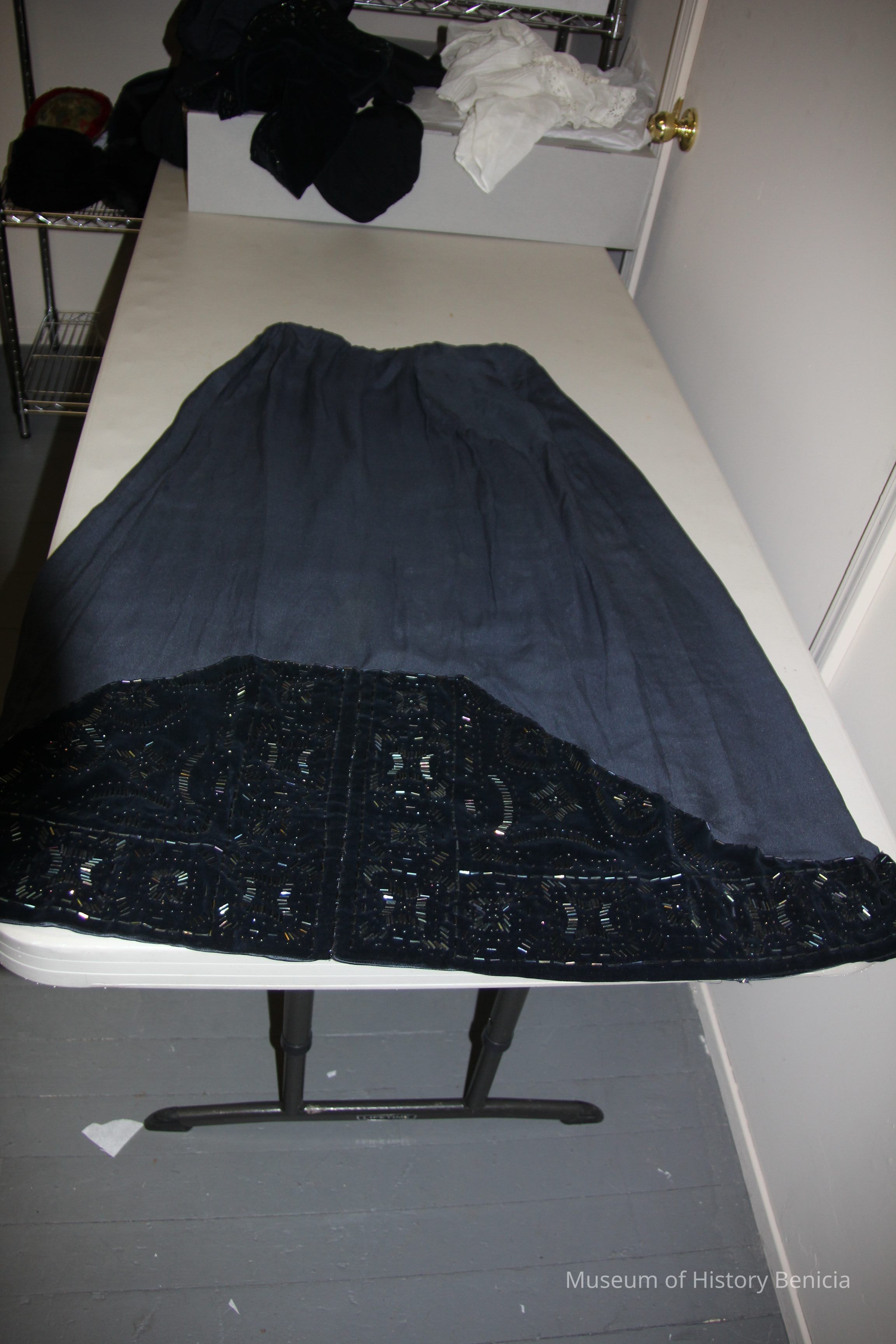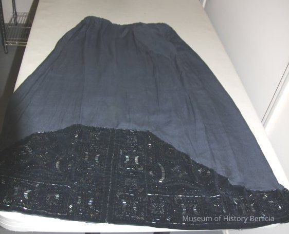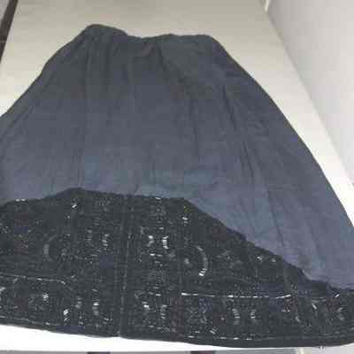 Navy blue long silk skirt with navy blue velvet trim. Bead work on velvet trim has matching bolero.