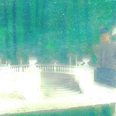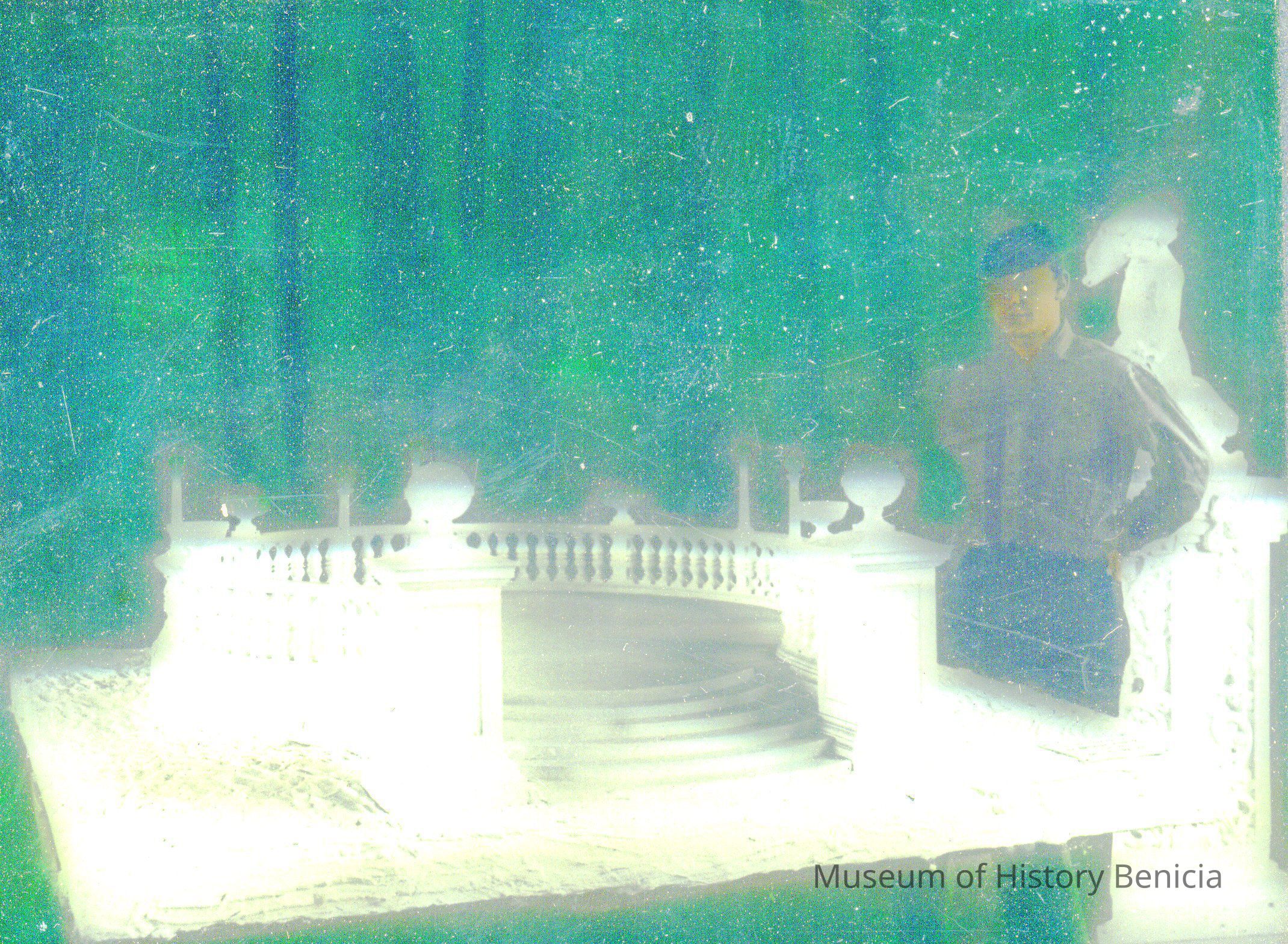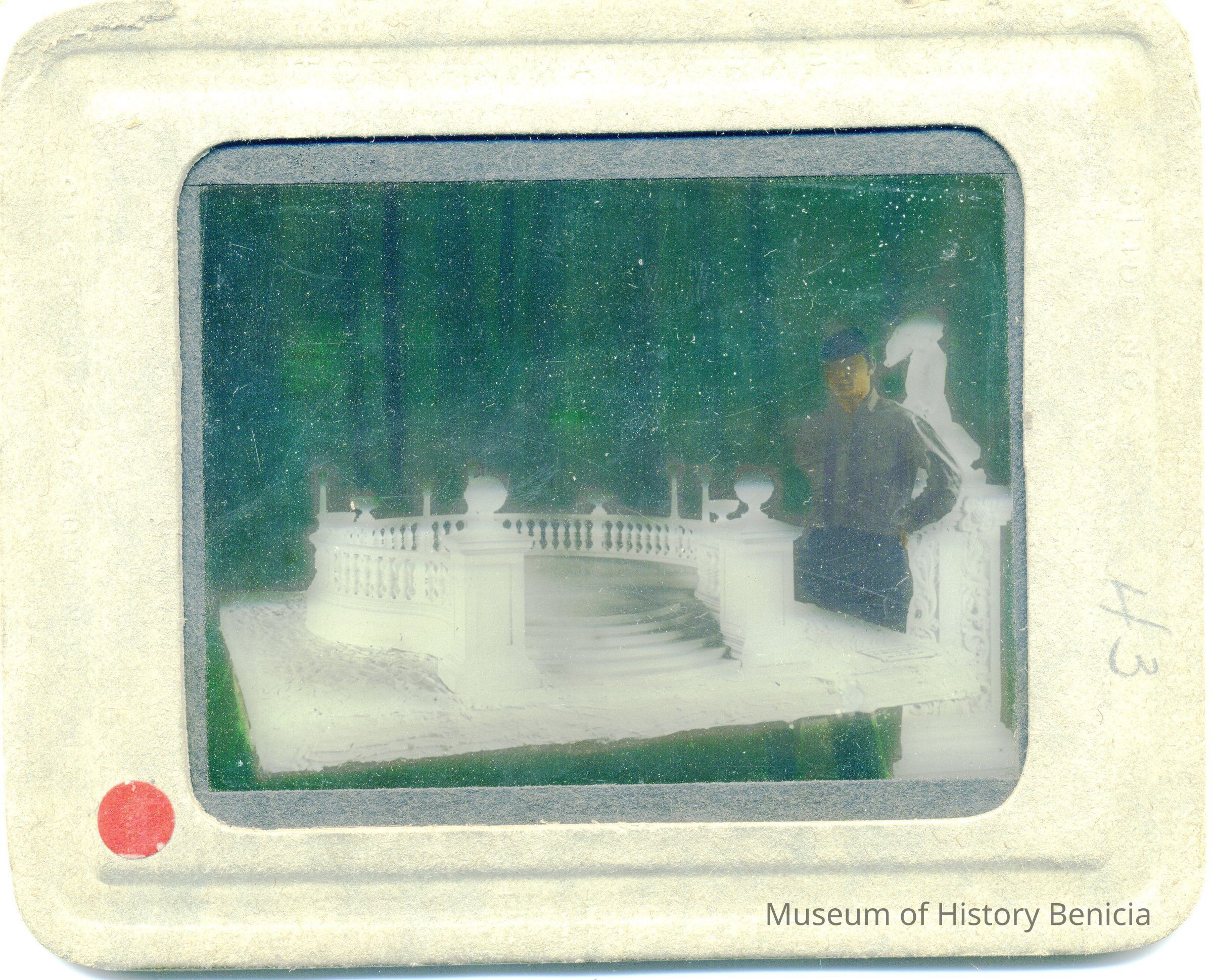 This is a Magic Lantern slide made by the Vistor Animatographic Co. of Davenport Iowa. It shows an unidentified man standing next to a model of a bandstand or gazebo.