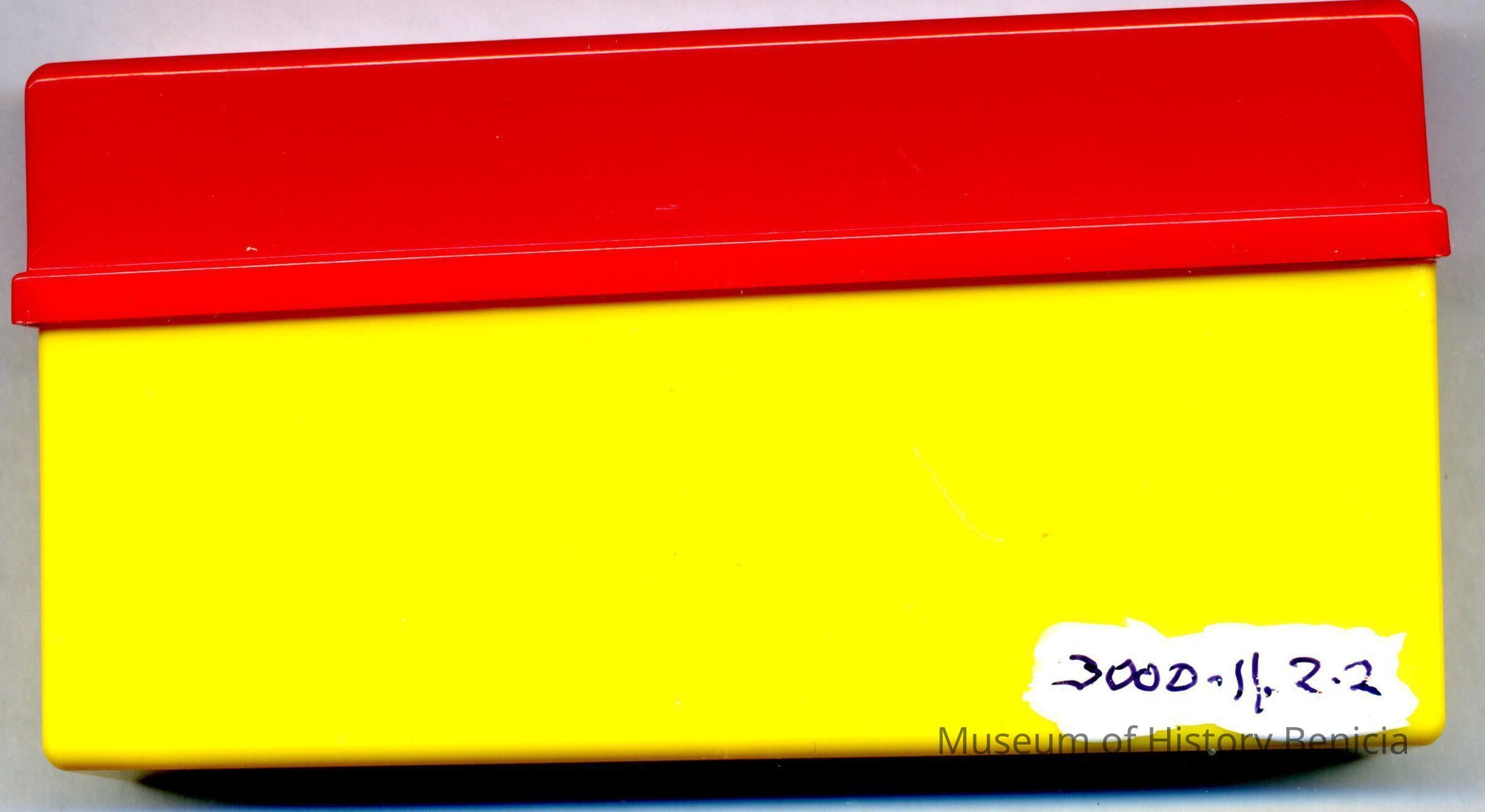 This is a plastic box made for holding 35mm slides. It is red on top and yellow bottom.