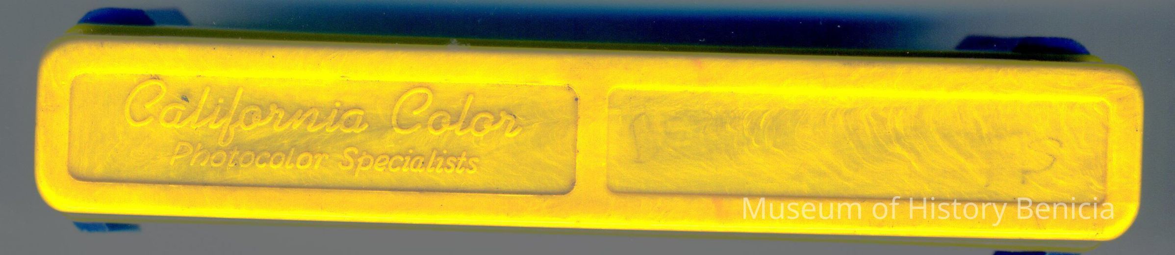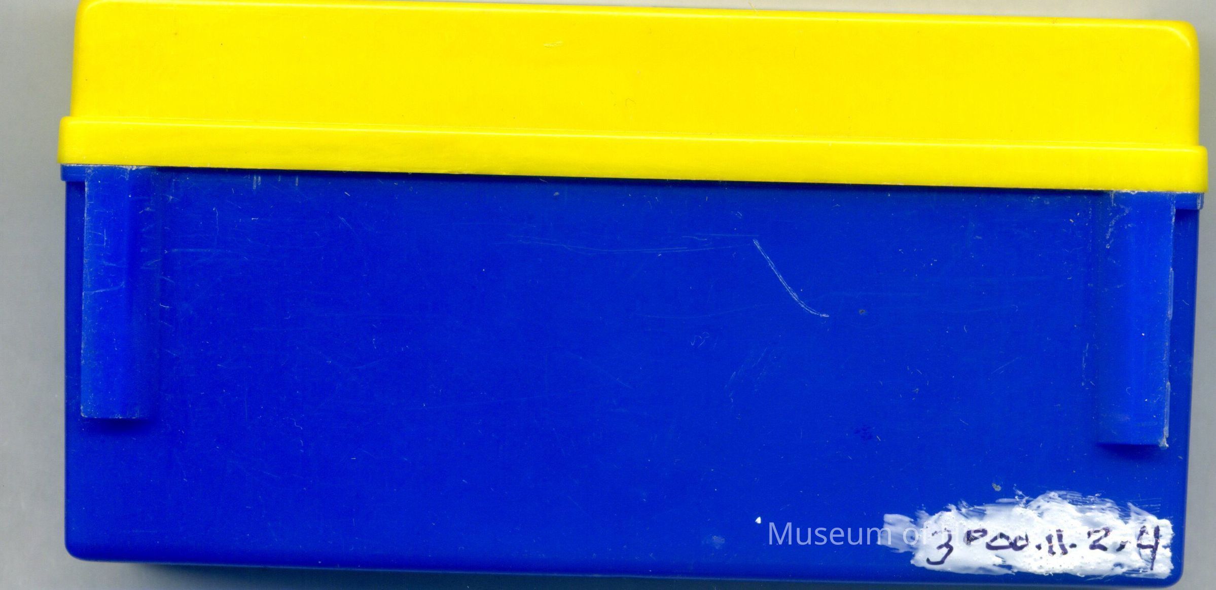 This is a plastic box made for holding 35mm slides. It is yellow and blue.