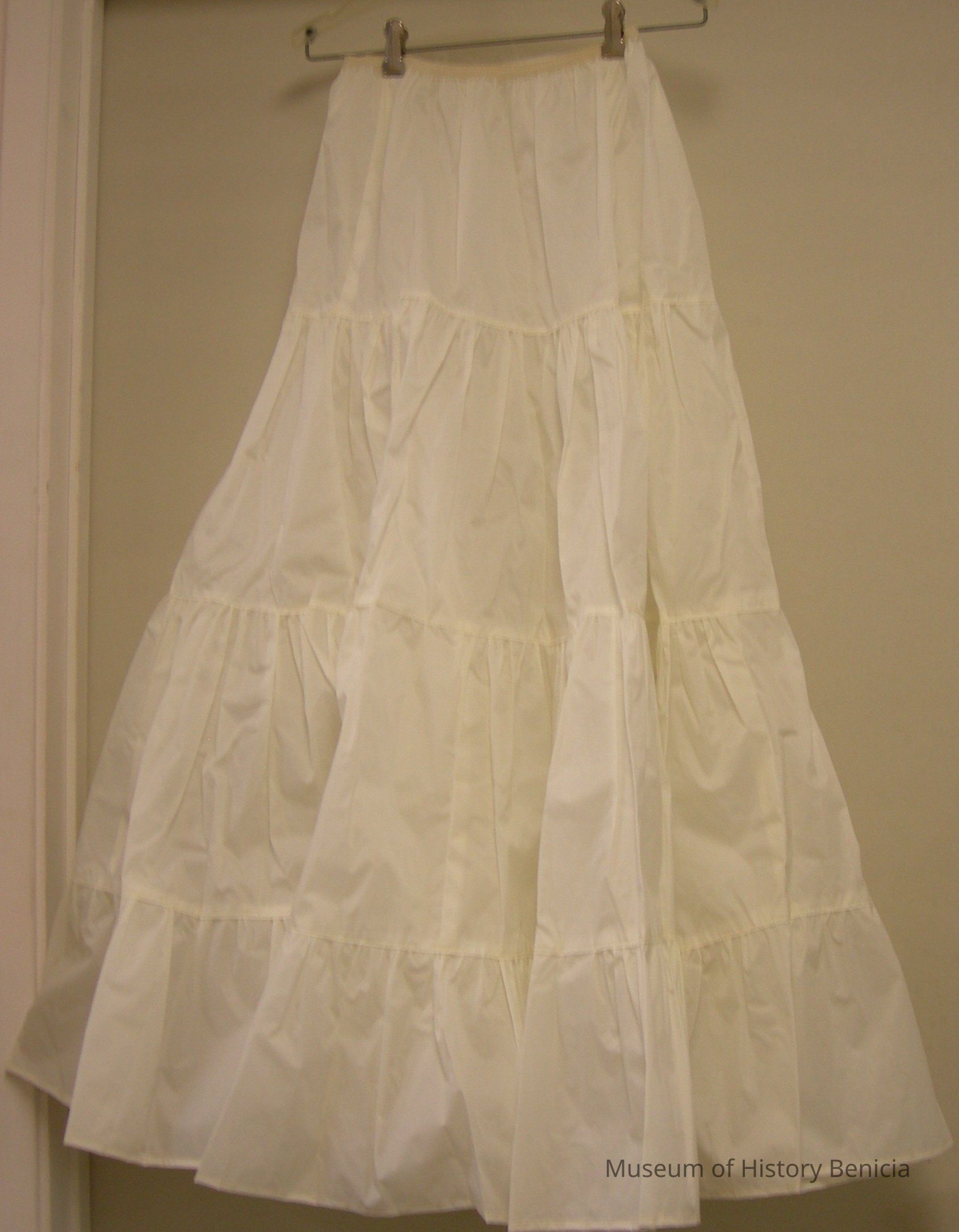 Half slip, floor length made from white taffetta, four-tier for wearing with a floor length formal, elastic waist, 38" long. Handmade by Ann Marchioni to be worn with a yellow floor-length formal by Roberta Marchioni at the Benicia High School Junior Prom in April 1959.Collection