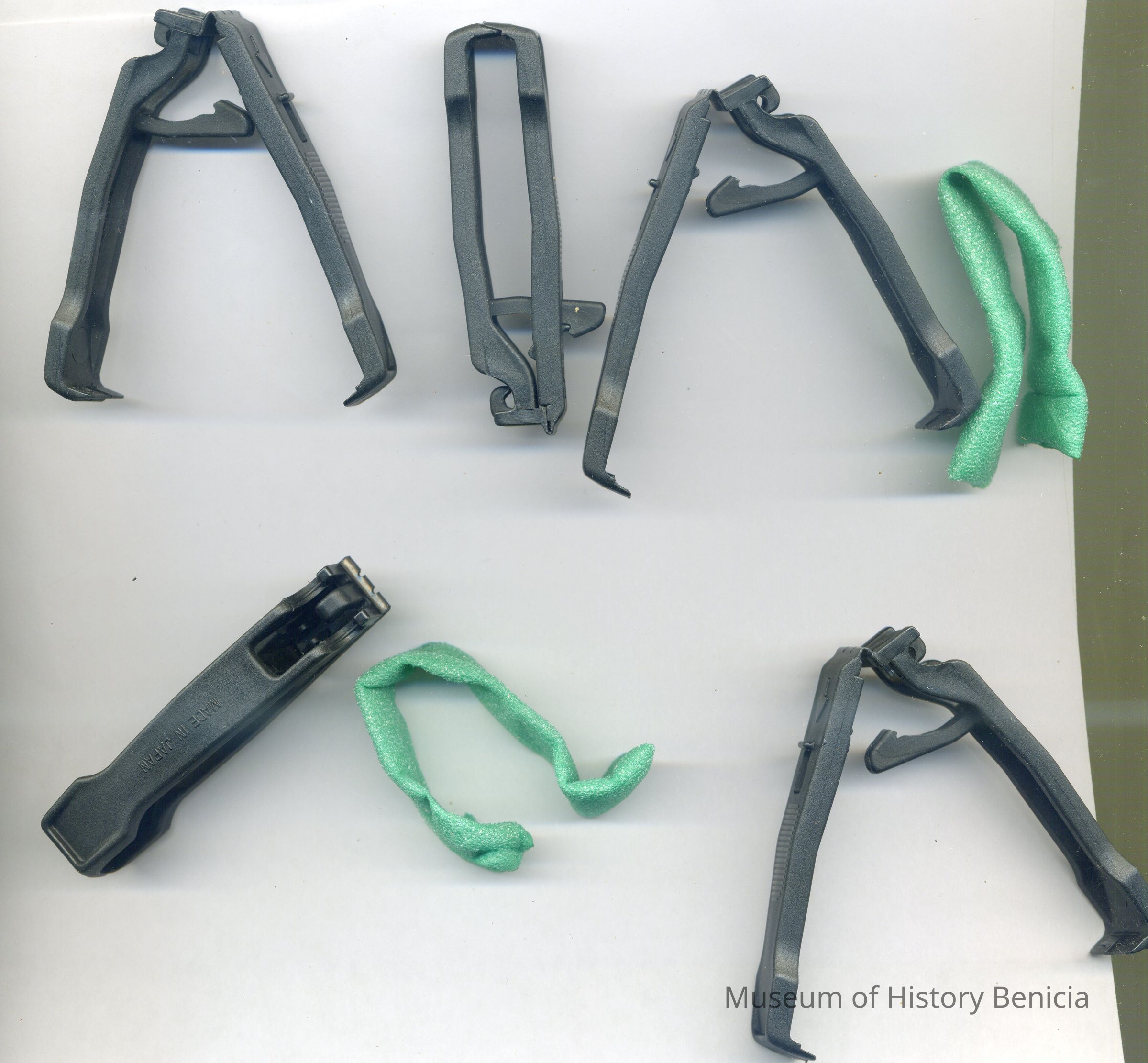 A package of eight plastic snaps made in Japan. They are about 3 inches long and 2.5 inches wide when open. They are with eight pieces of green foam. Not sure of the purpose of these.Collection