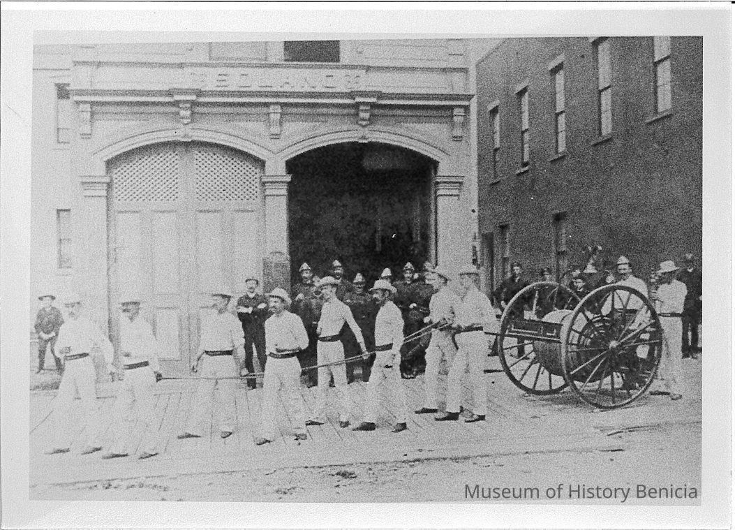 Copy of an earlier photograph - Black and white photograph of the Solano Engine Co. C. 1860 Next to capital on 1st street - the pic is a pic of a pic or the date on the image is wrong. Either way, it's not an 1860s imageCollection