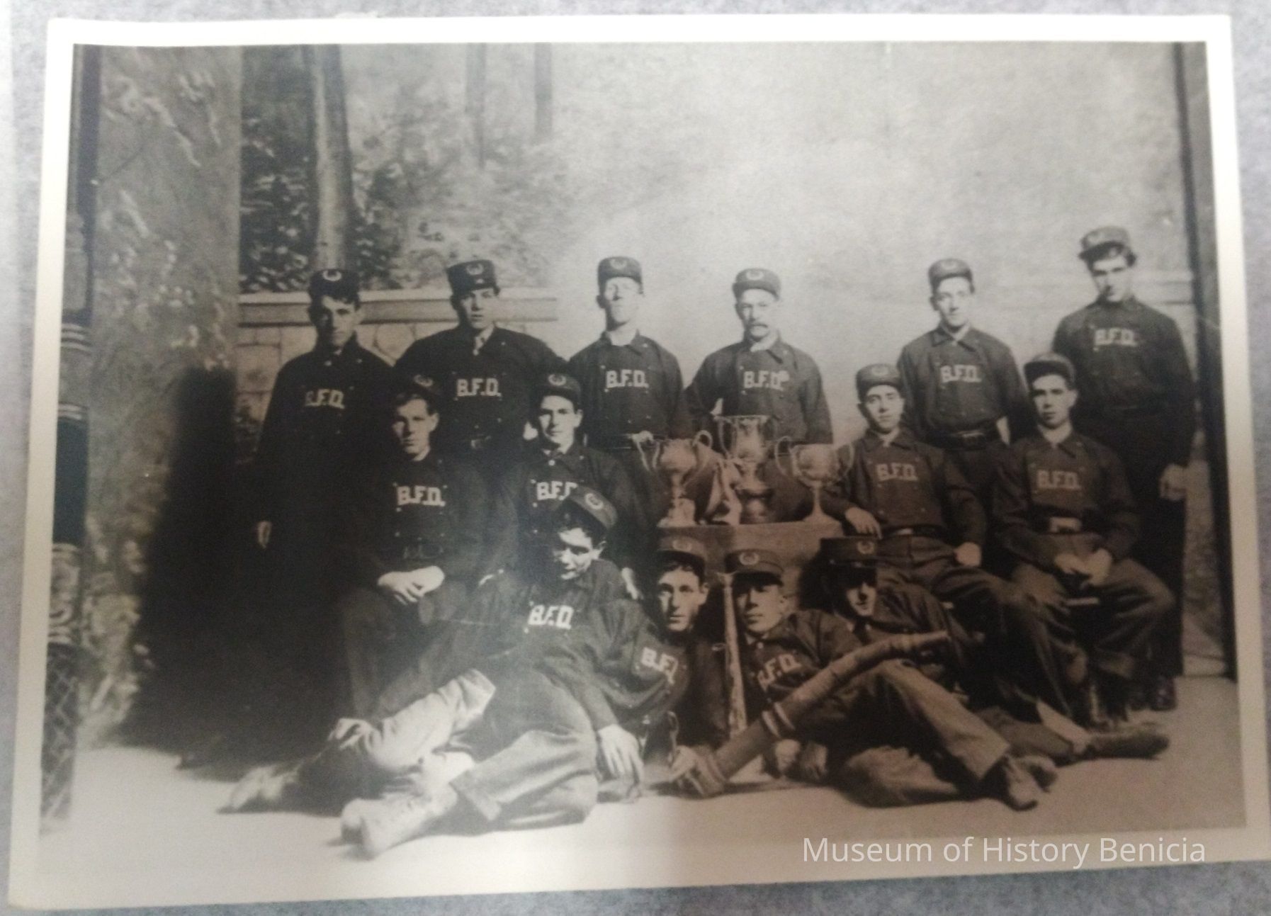 Picture of a picture - Solano Engine Company Solano Engine House 1860 - B/W image of 14 firefighters with trophies, speaking trumpet and hose nozzle - One man in front holding toolsCollection