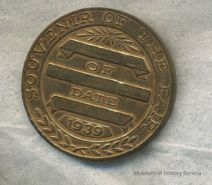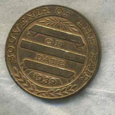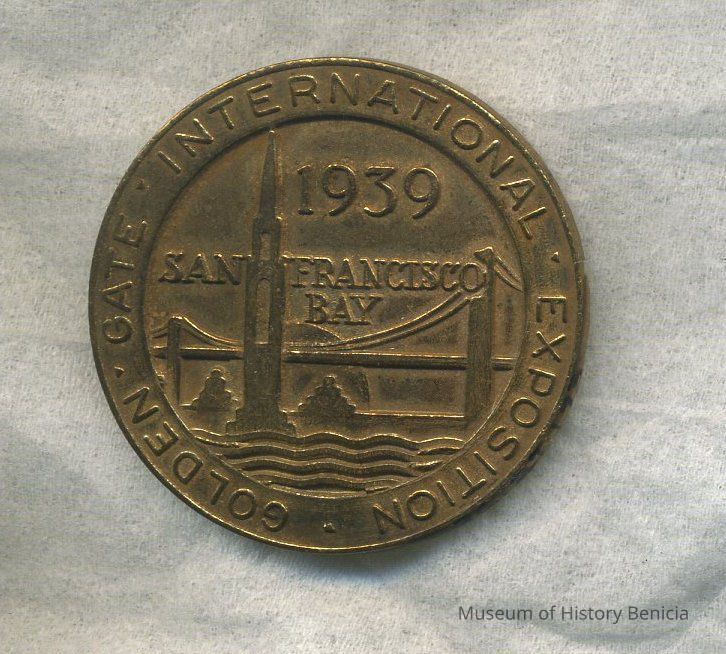 Brassy disc with "Golden Gate International Exposition 1939 - San Francisco Bay" on one side and "Souvenir of the Fair of the date 1939" on the other.