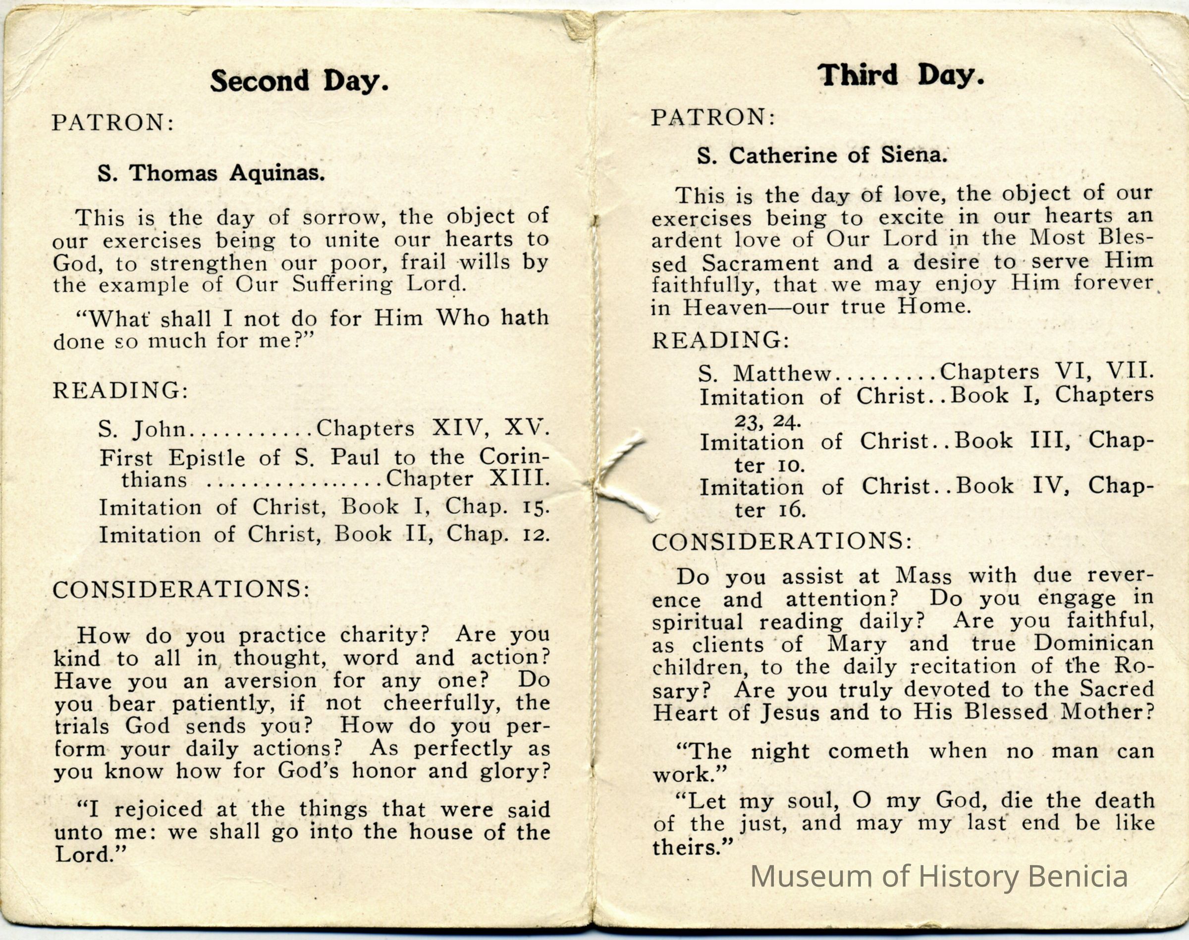 This is a souvenir of a Spritual Retreat made by the Dominican College in San Rafael in 1906. There are three days of readings and things to consider listed in the booklett. The back page list the "fruits" to be derived from the retreat.Collection