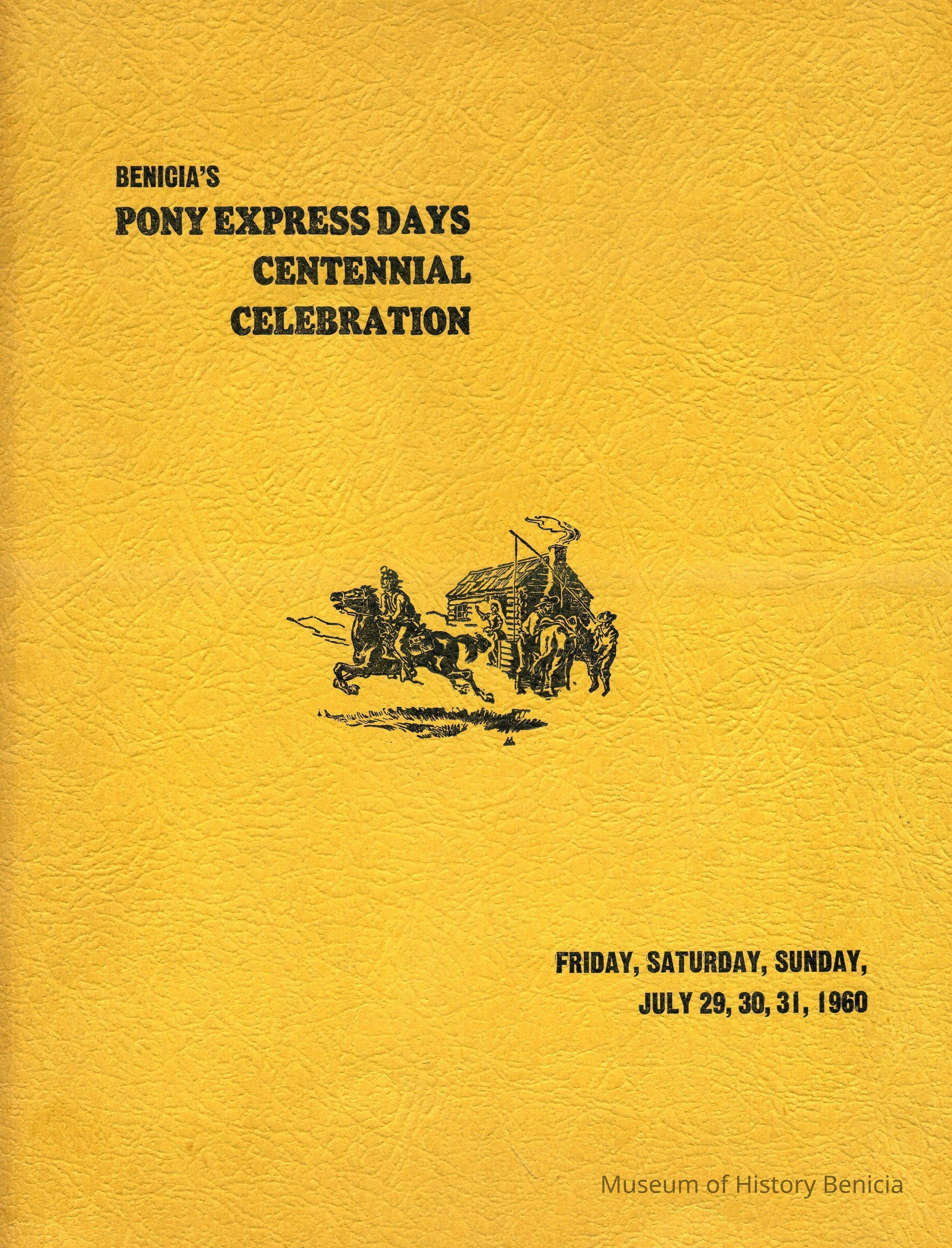 Includes: four pages of The Pony Express Story, The agenda for The Pony Express Days Program; b/w photographs of the seven girls vying for the honor of being the Queen of the Pony Express celebration and many advertisements for Benicia businesses.