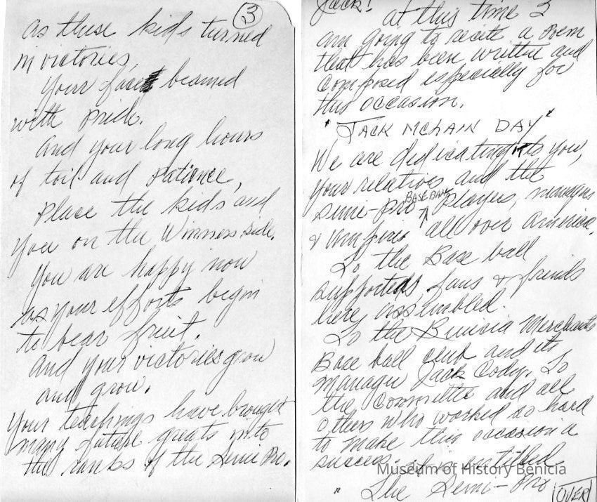 Speech probably written by Jack O'Grady regarding a plaque for 50 years in baseball. It mentions this is for Jack McClain. It also mentions a poem written for the occassion called "The Semi-Pro". (A copy of the poem is in the collection).Collection