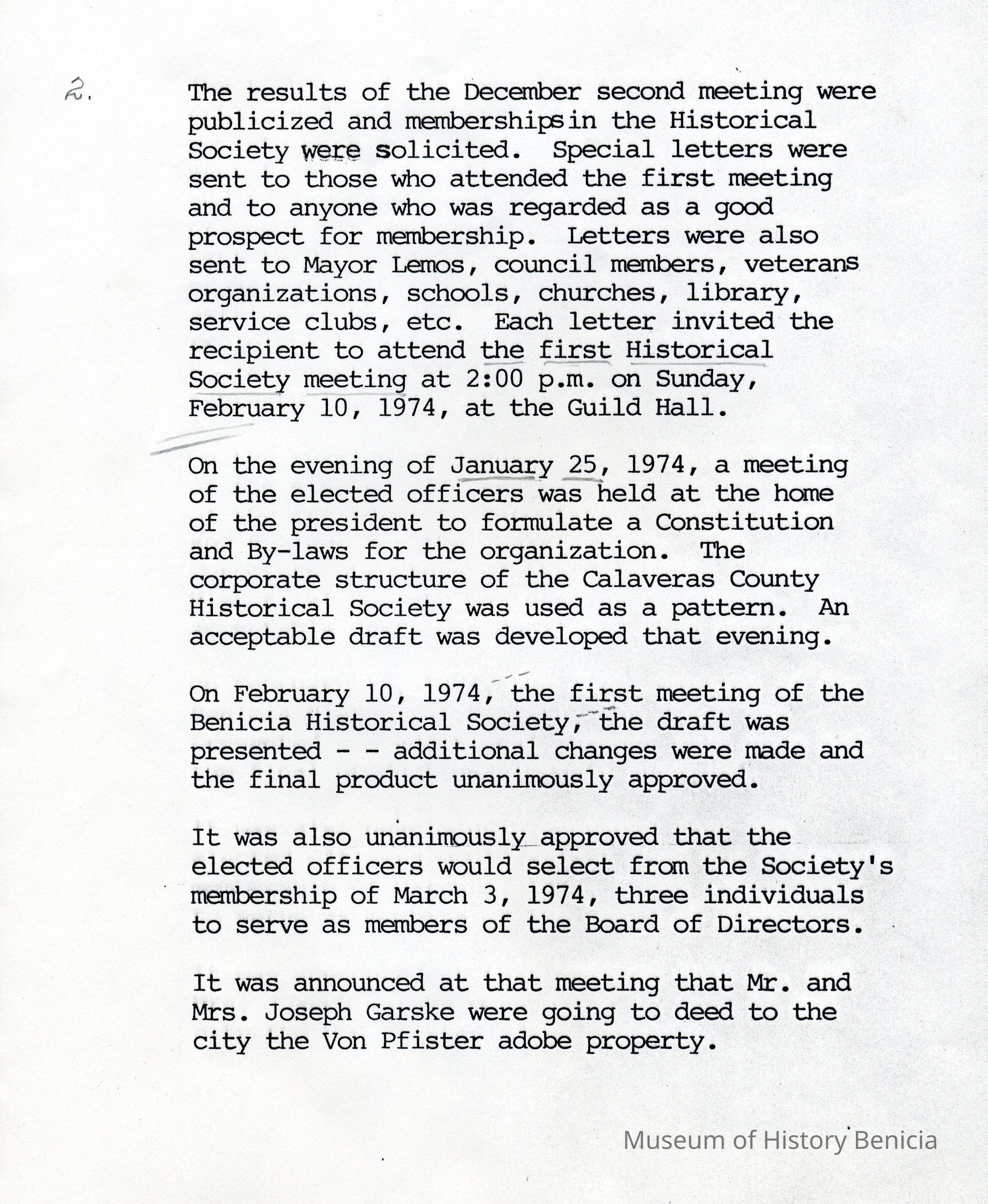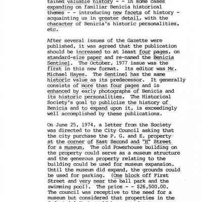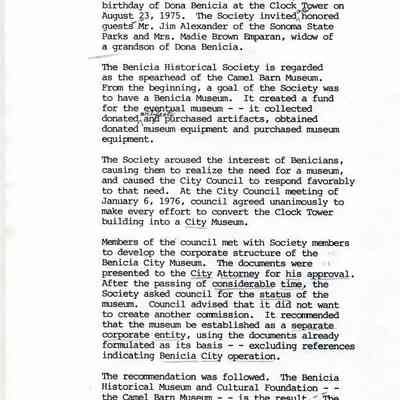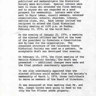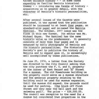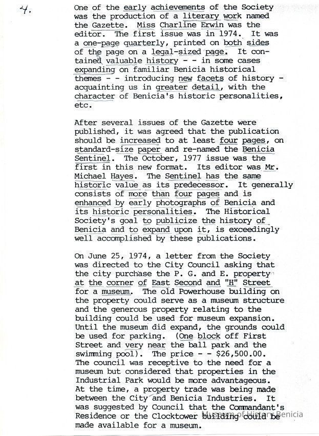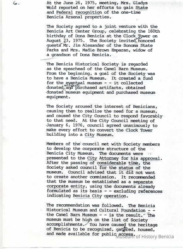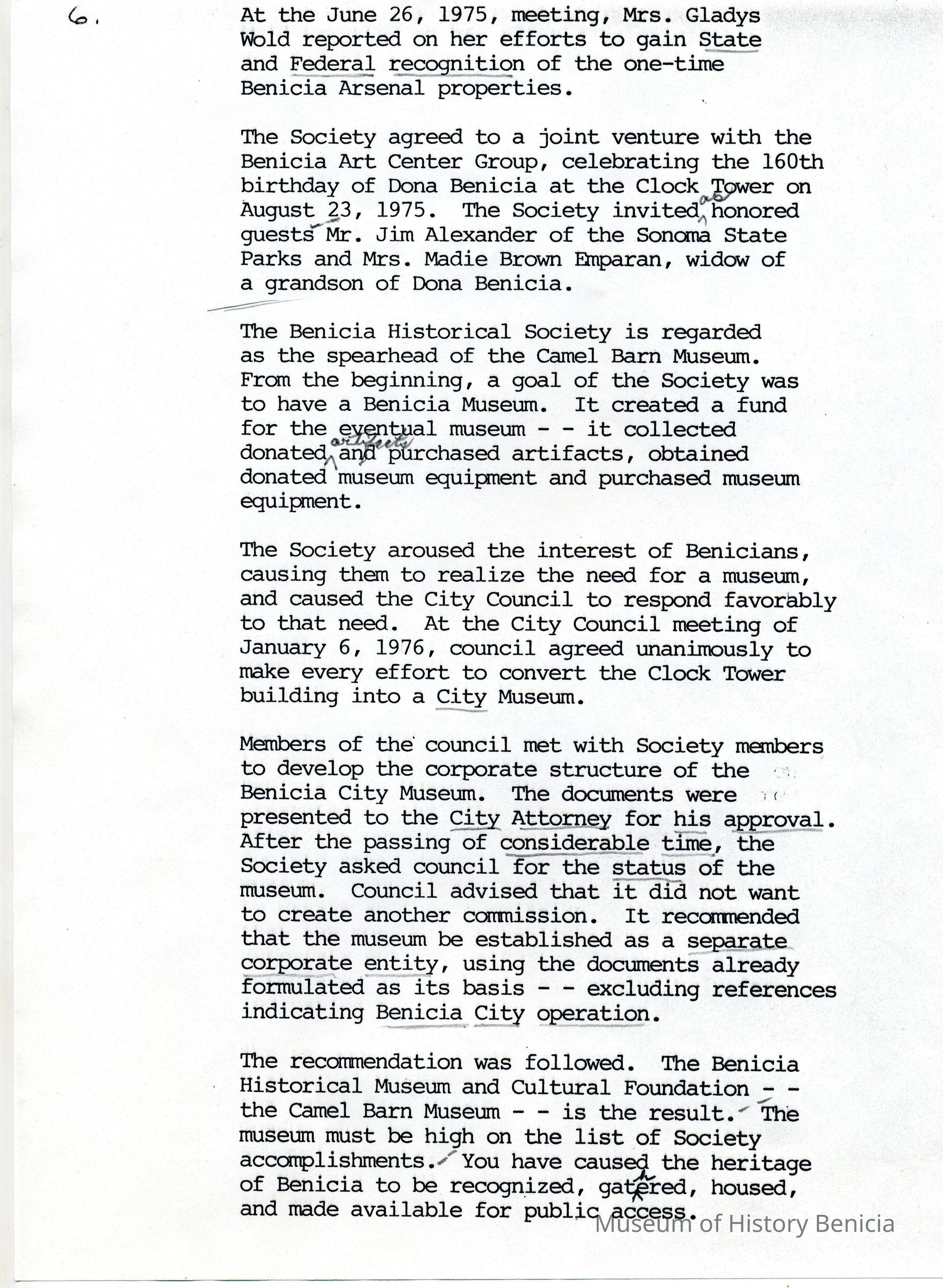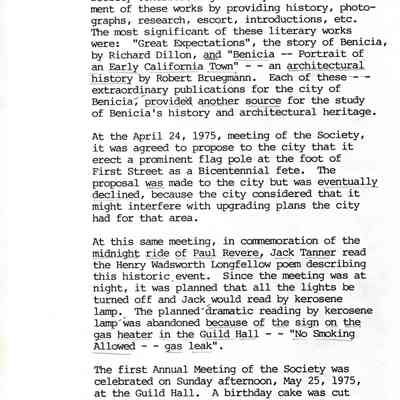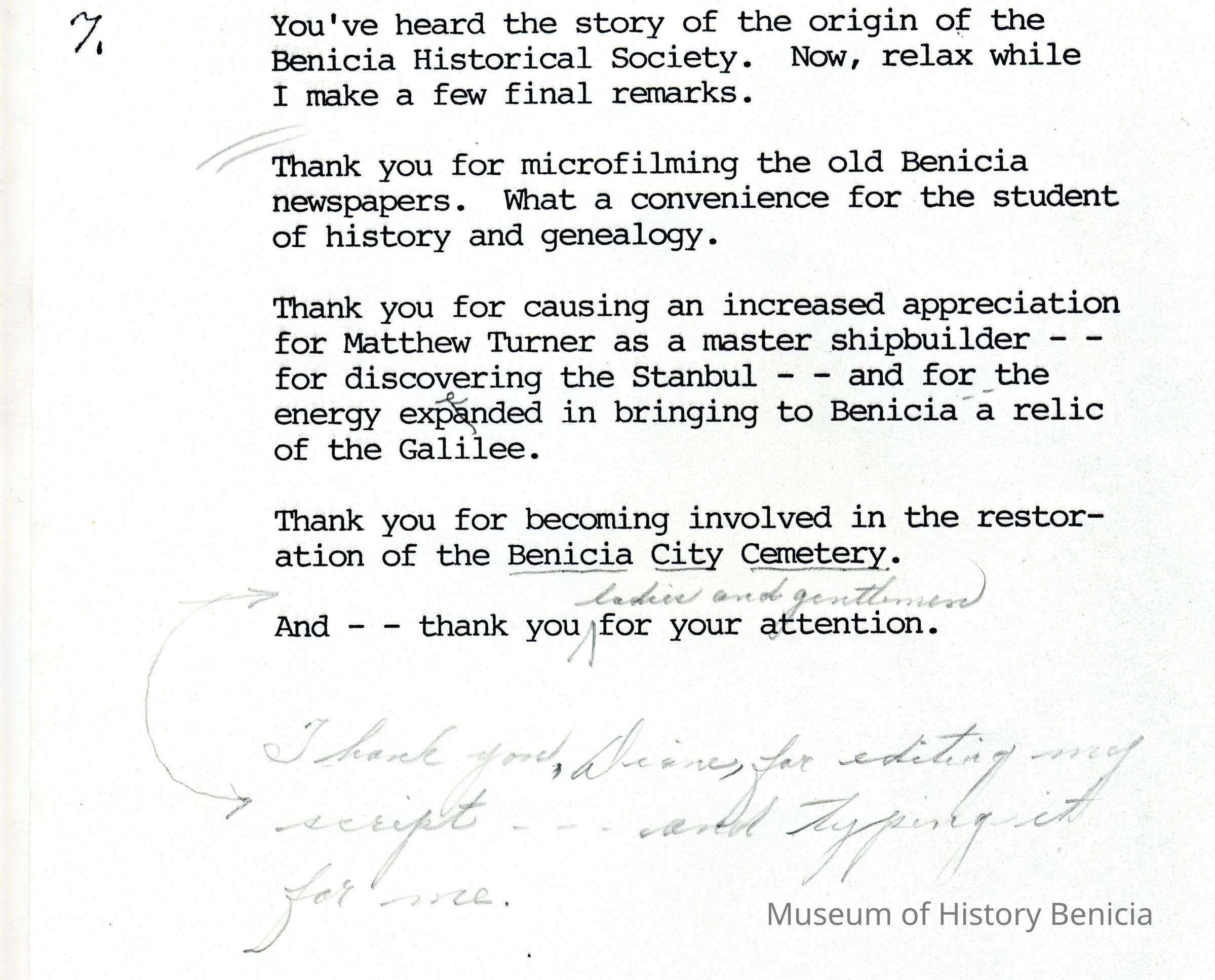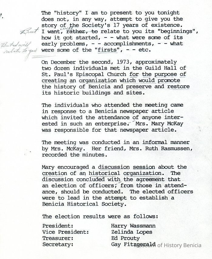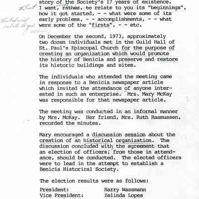 This is a 7 page speech presented by Harry Wassmann to the members of the Benicia Historical Society. It chronicles the start of the Historical Society and it's early accomplishments including the creation of the Benicia hIstorical Museum. The date isn't indicated but was probably 1976/1977.Collection