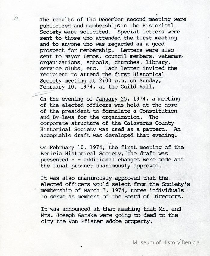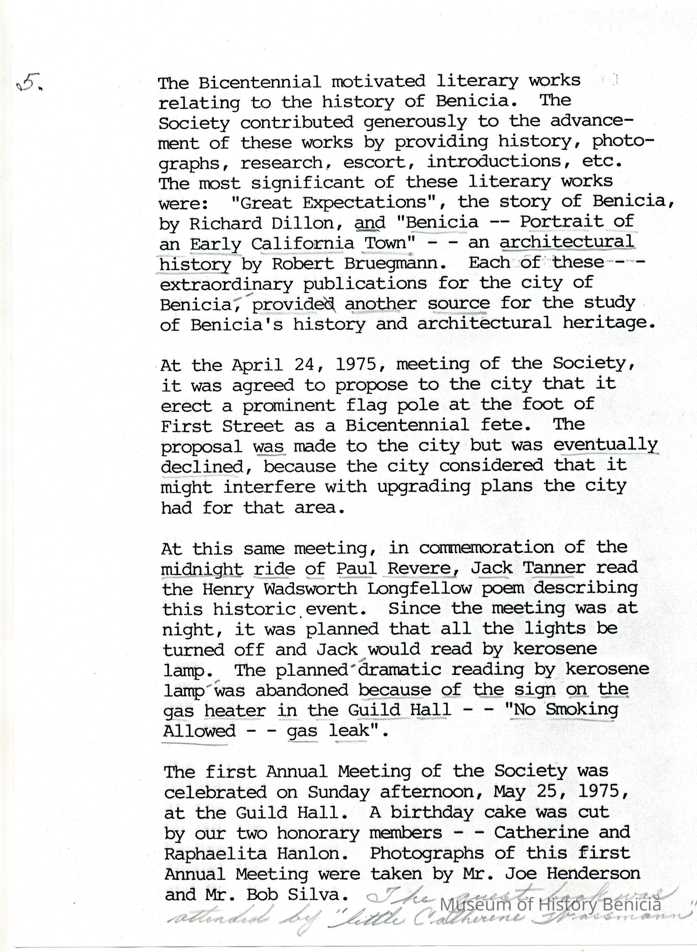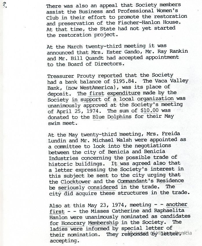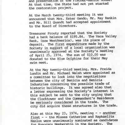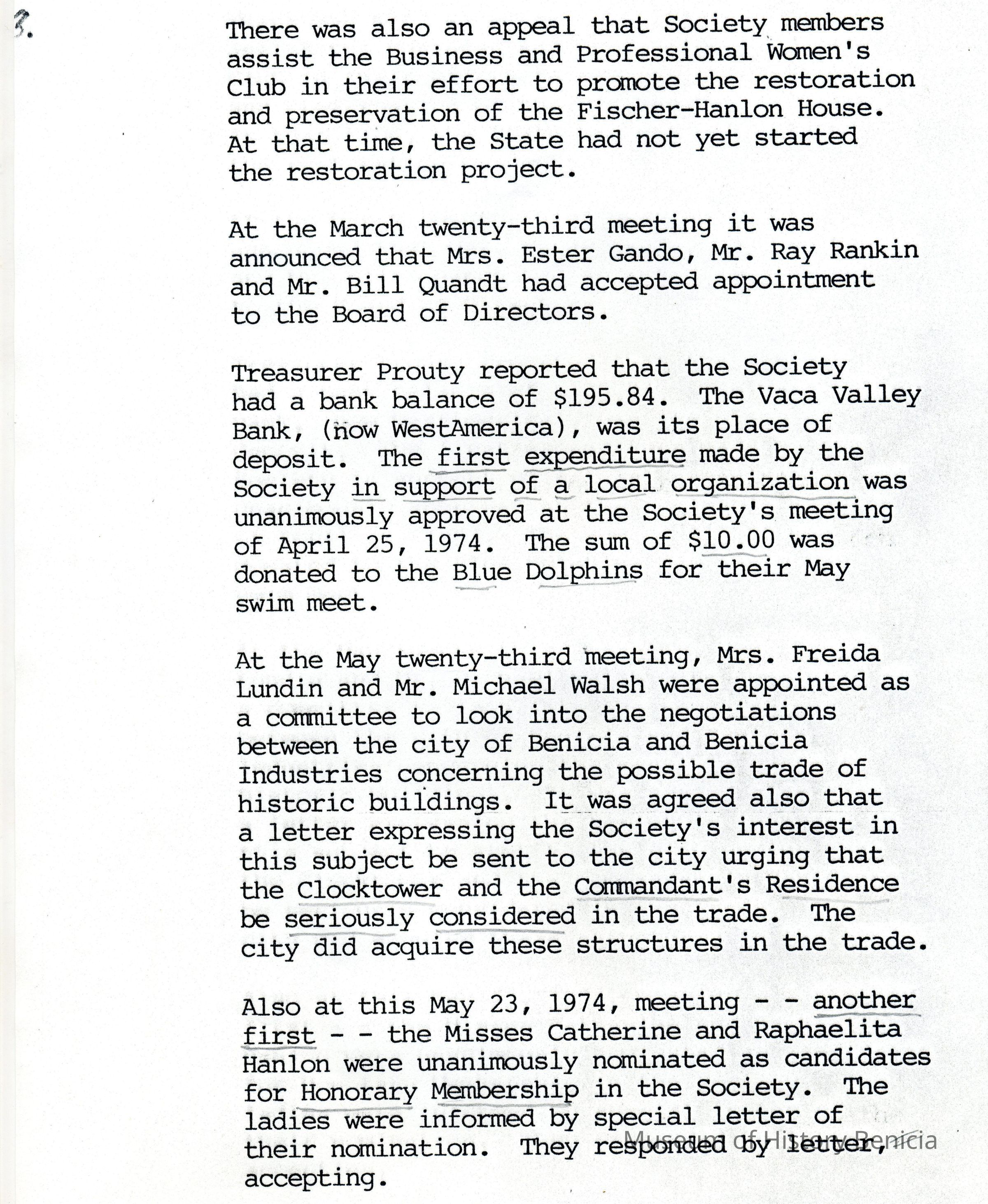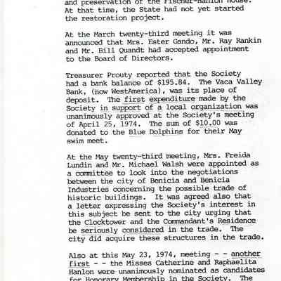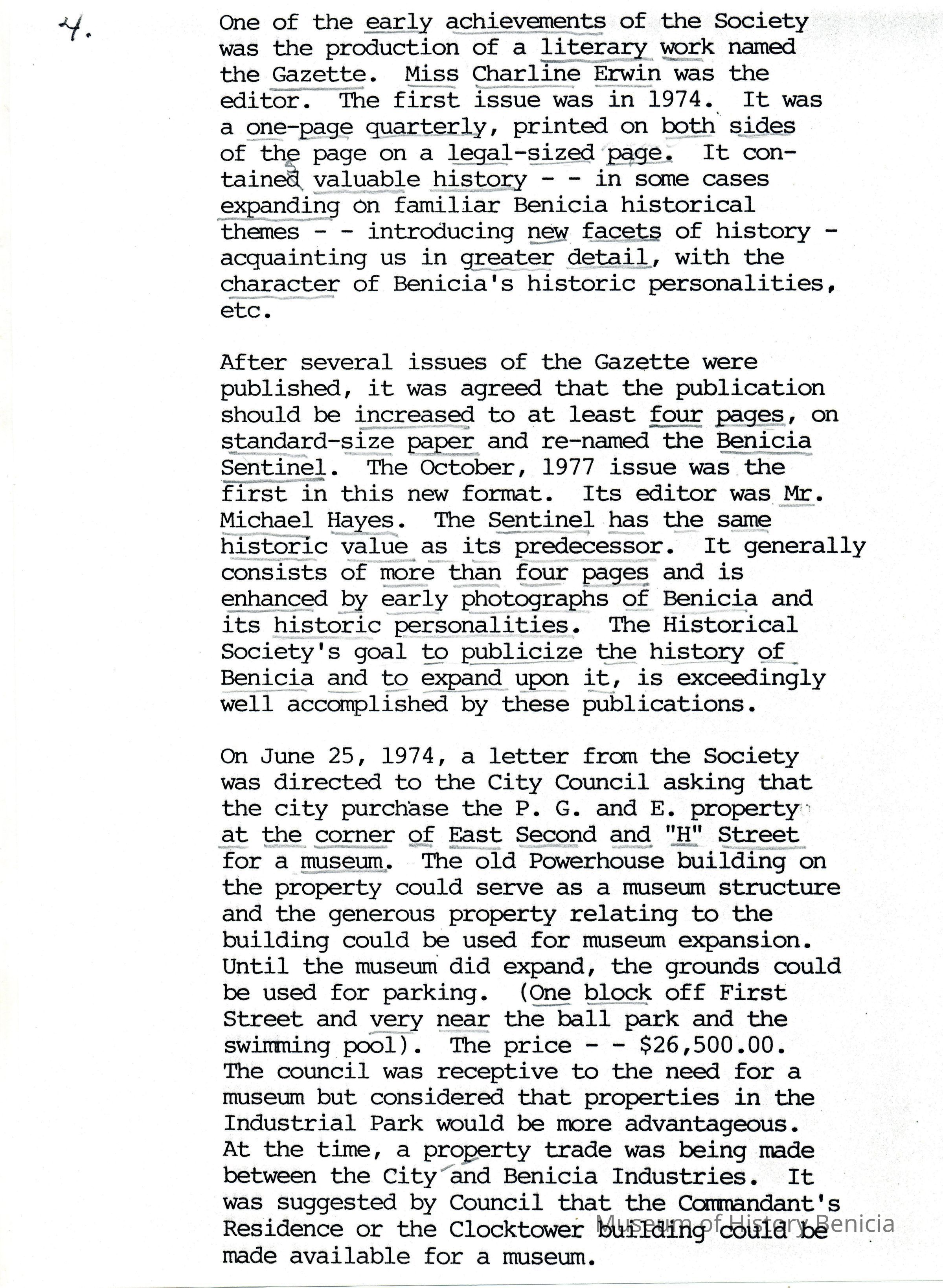 This is a 7 page speech presented by Harry Wassmann to the members of the Benicia Historical Society. It chronicles the start of the Historical Society and it's early accomplishments including the creation of the Benicia hIstorical Museum. The date isn't indicated but was probably 1976/1977.Collection