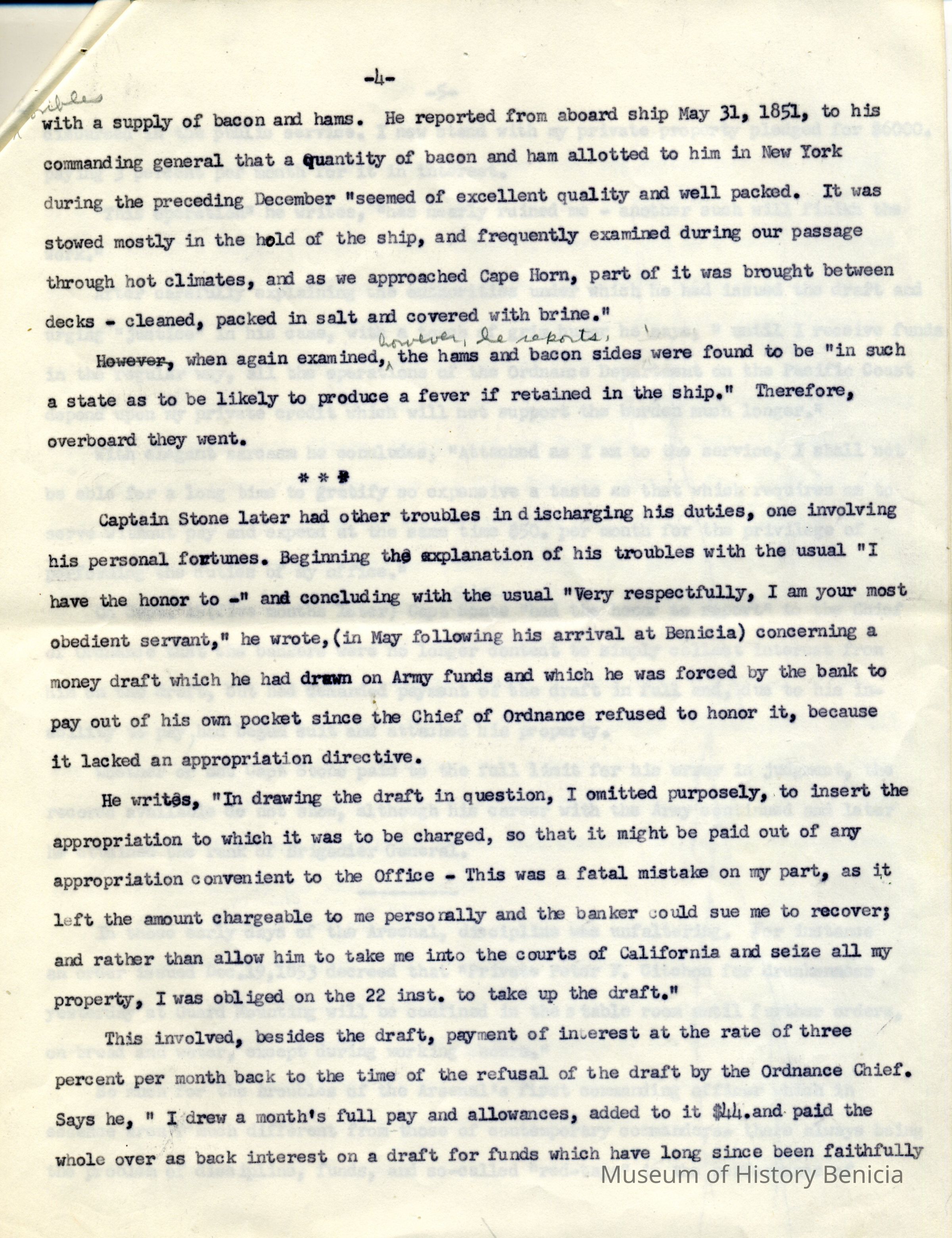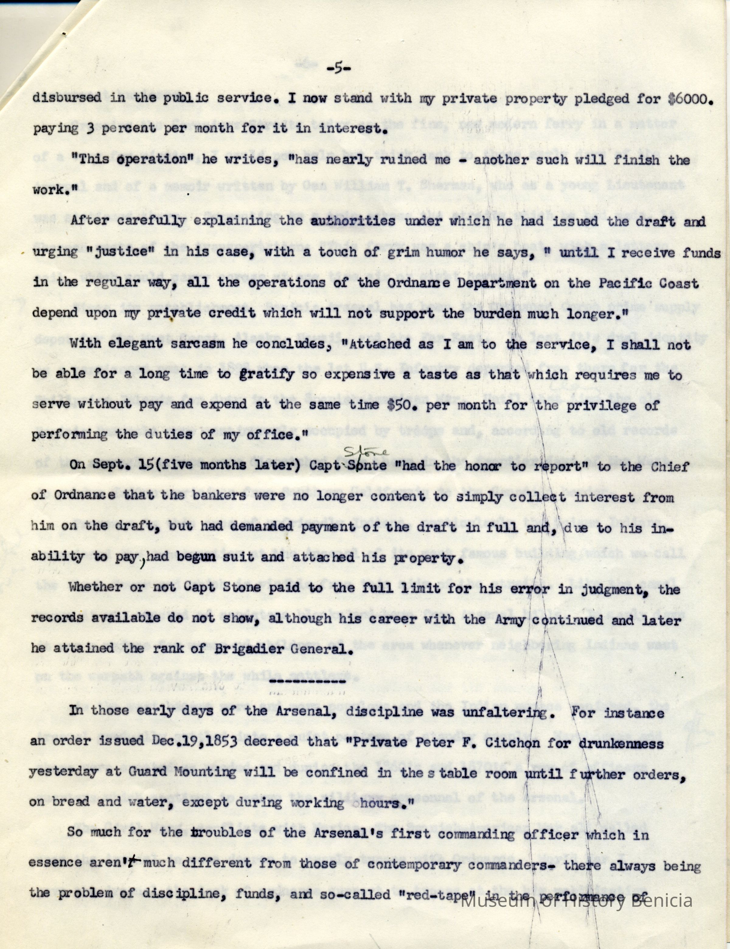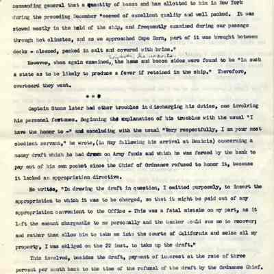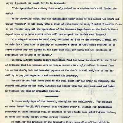 The speech is full of little known facts. It explains where the word "Ordnance" is derived, the trials and tribulations of Captain Stone in getting to Benicia and then in erecting its fiirst buildings, the almost total financial ruin Stone suffered in the early days, the departure of the U.S. Infantry in 1898, etc. He also details the growth of the Benicia Arsenal during WWII and then further growth during the Korean Conflict.Collection