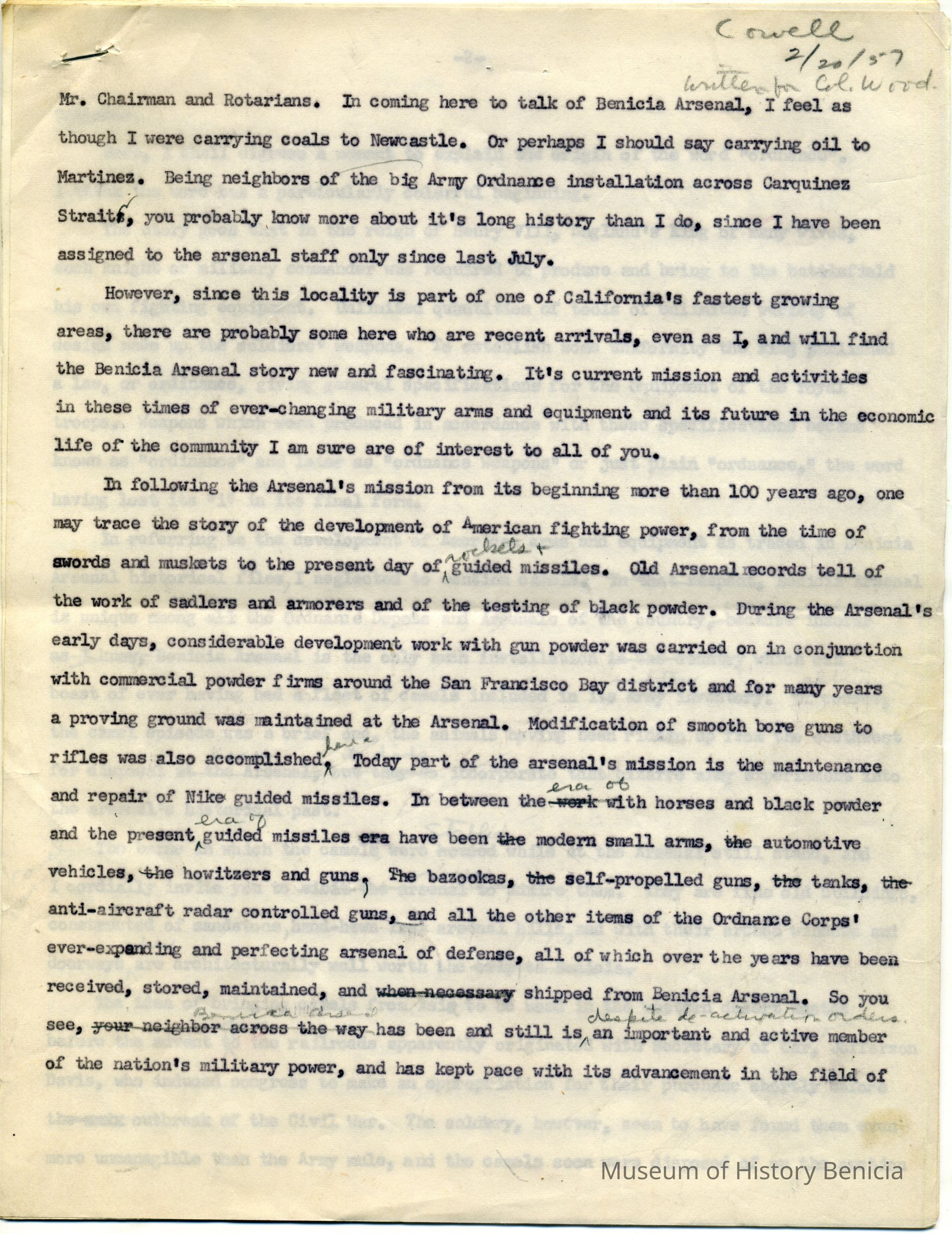 This is a copy of a speech written by Josephine Cowell for Col. Wood on 02/20/1957. He gave this speech at the Rotarian meeting in Benicia.