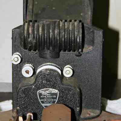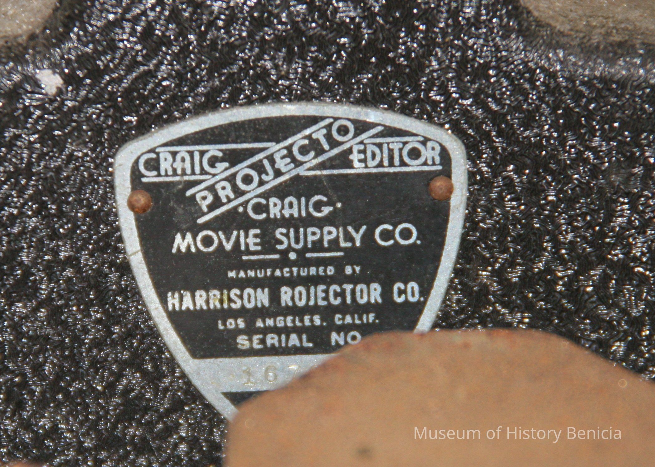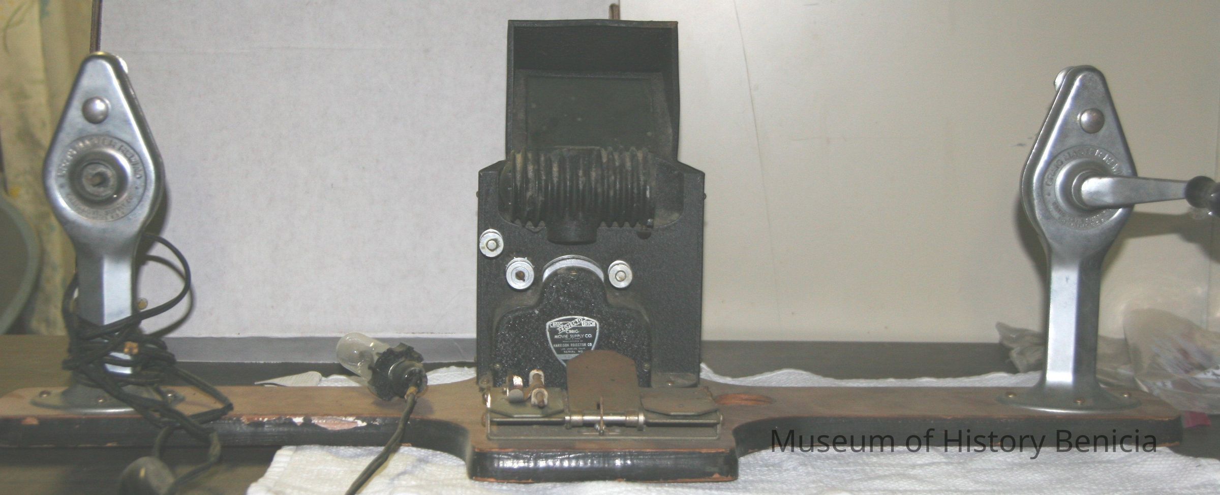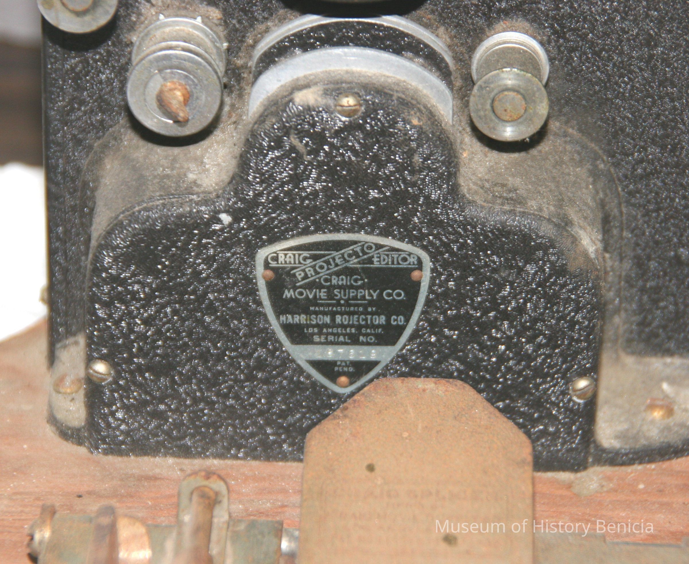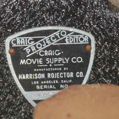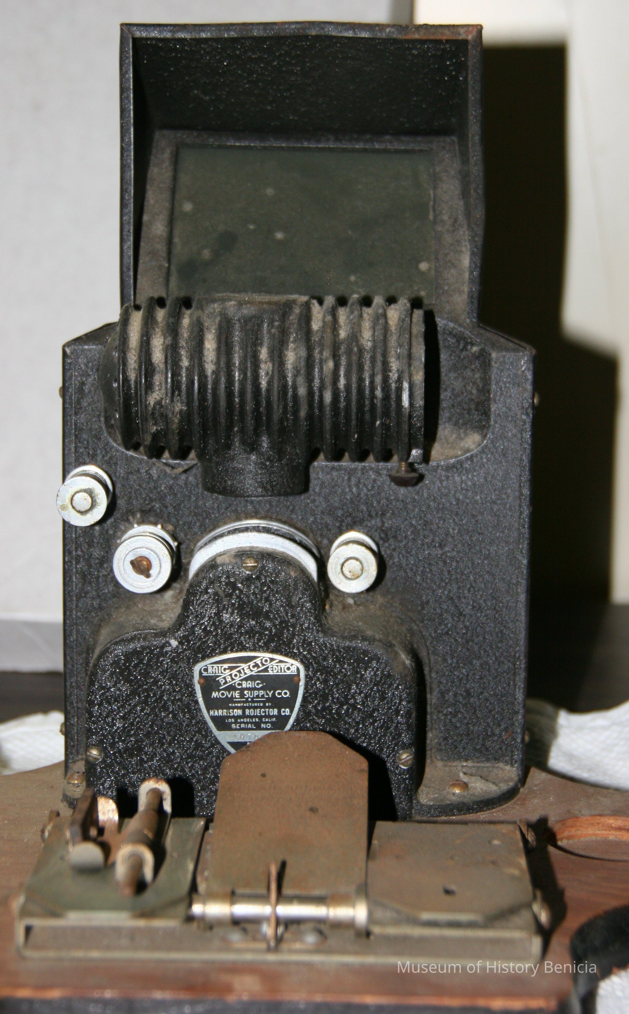 Craig Projecto Editor. Wooden platform with film viewer made of metal. Cutting mechanism in front, two manually operated film spools. Electrical.