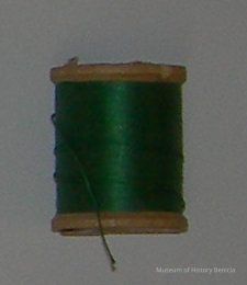 wooden spool with green thread Brand: Coats & Clarks Mercerized sewing, boilfast, 125 yards, 15 cents