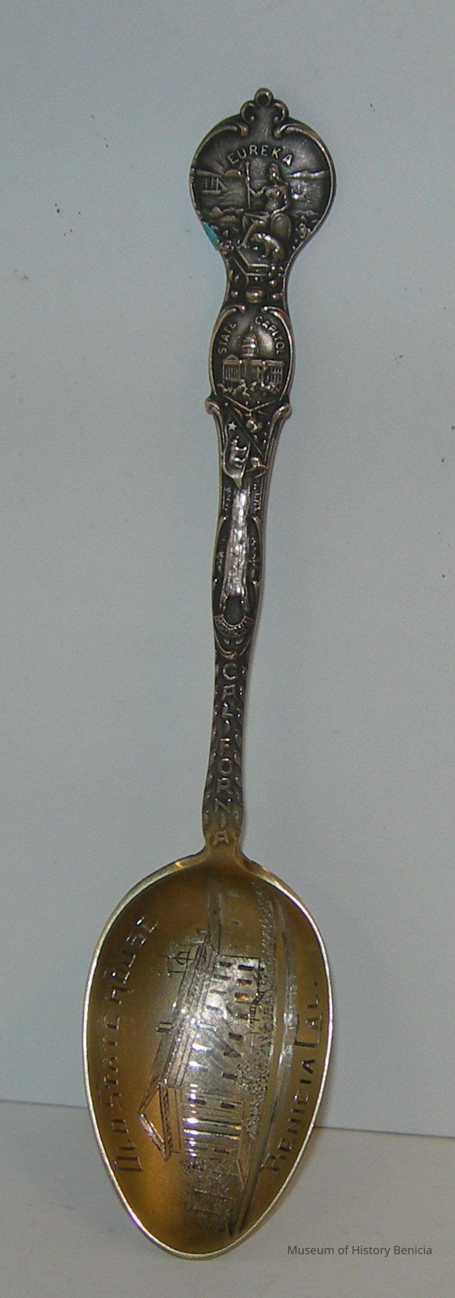 Souvenir spoon from Myrtle Mann collection. This spoon has the California State Seal on the end of the handle. Below it shows the California "State Capitol" building. Below that is a bear and redwood tree with the word "Wawona" next to it. Just before the spoon is the word "California". The spoon shows the Benica State Capitol building with the words "Old State House Benicia Cal." around the sides.