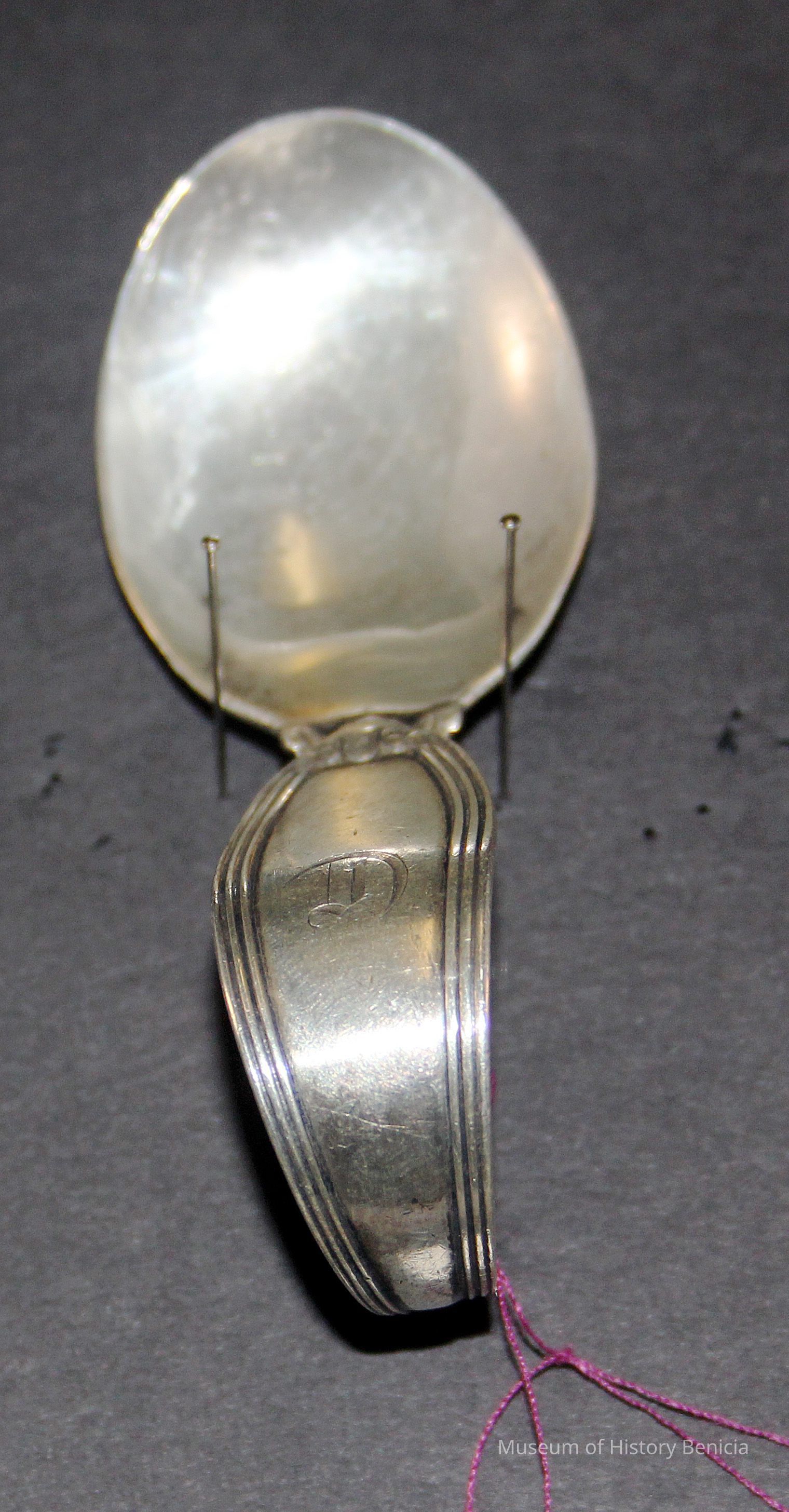 Souvenir spoon from Myrtle Mann collection. This is a baby spoon and has a curved handle and the letter "D" on the handle. It is 3.25" long.