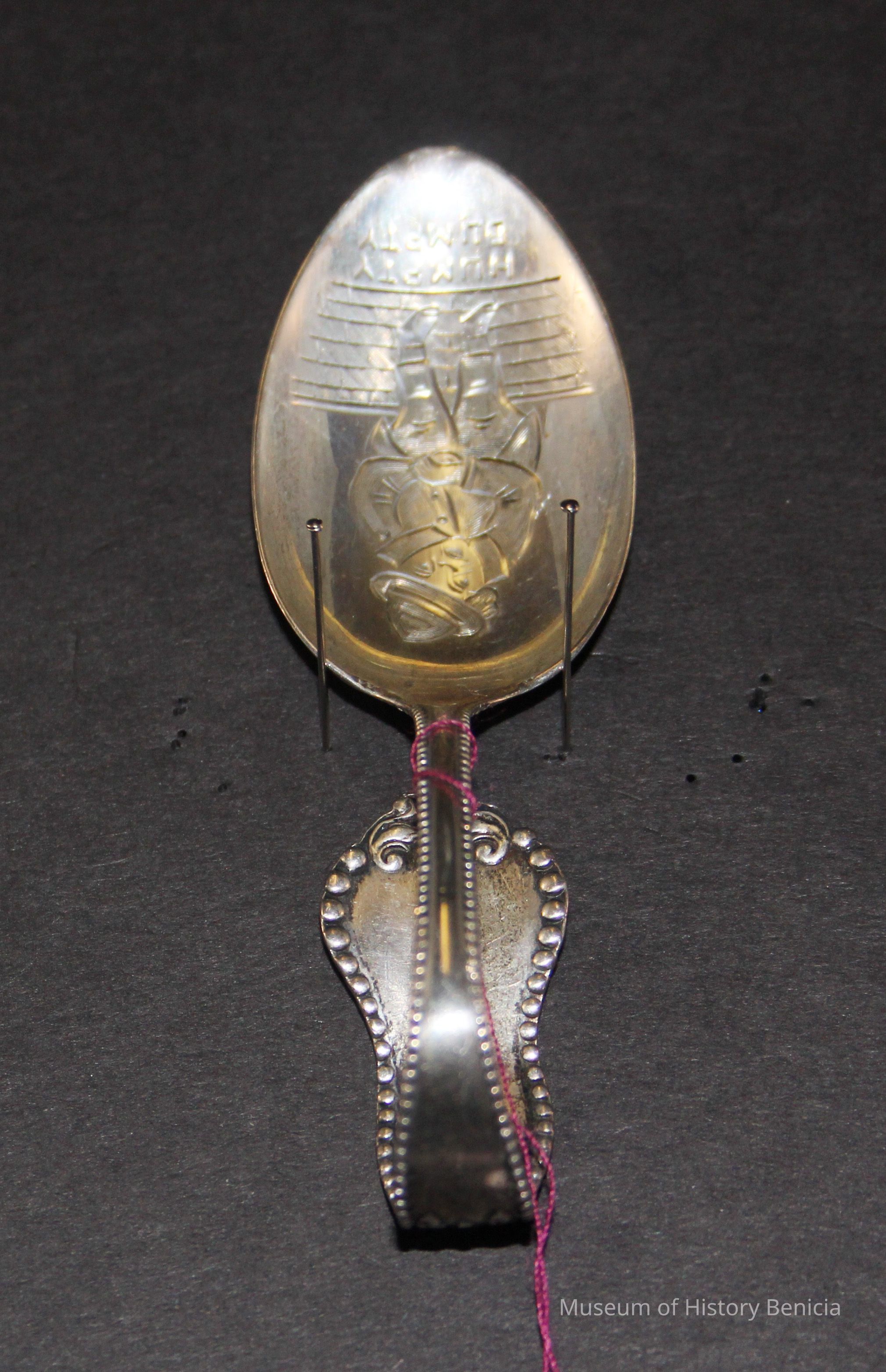 Souvenir spoon from Myrtle Mann collection. This is a baby spoon and has a curved handle and Humpty Dumpty in the bowl. It is 3.25" long.