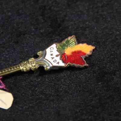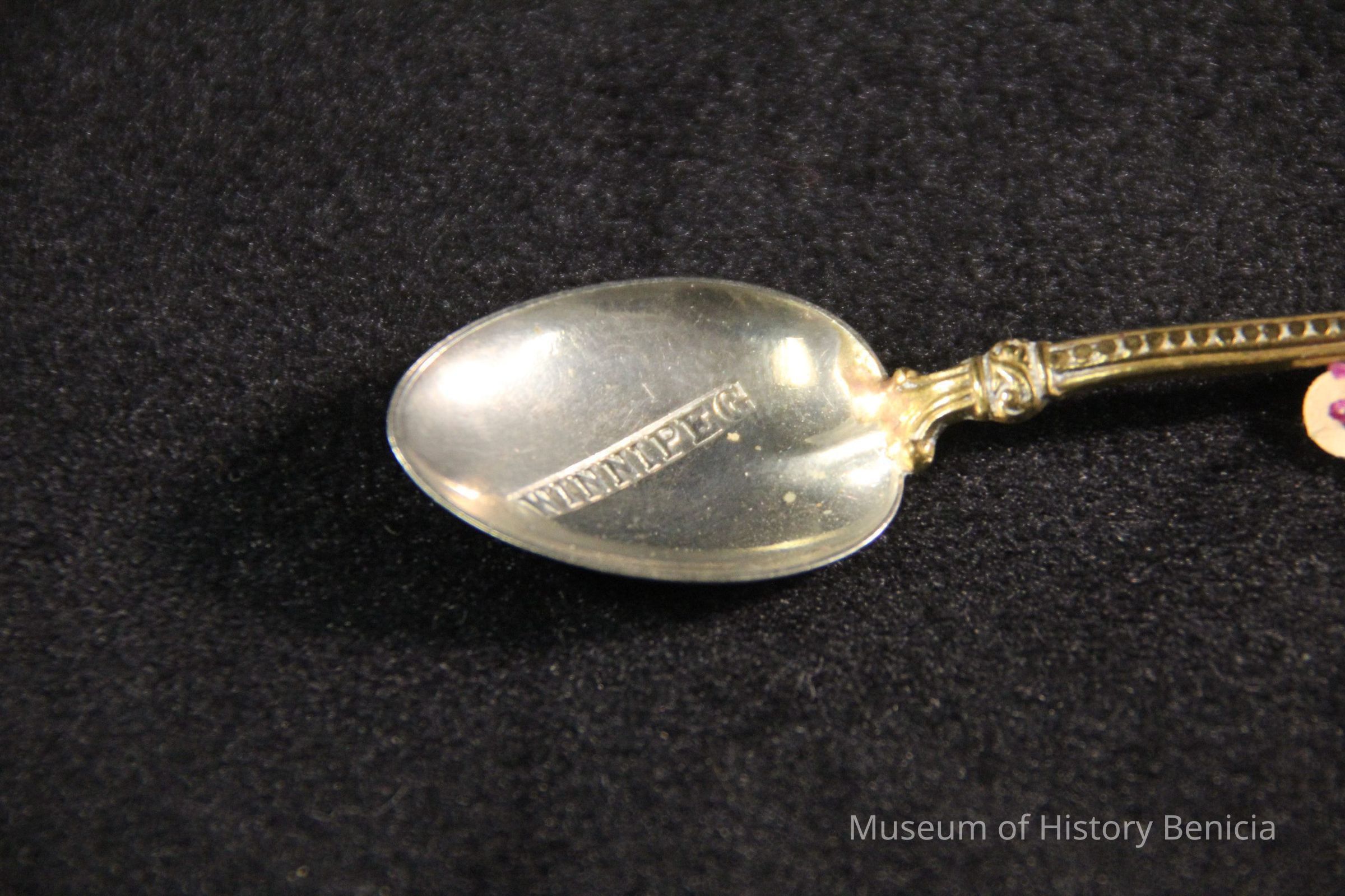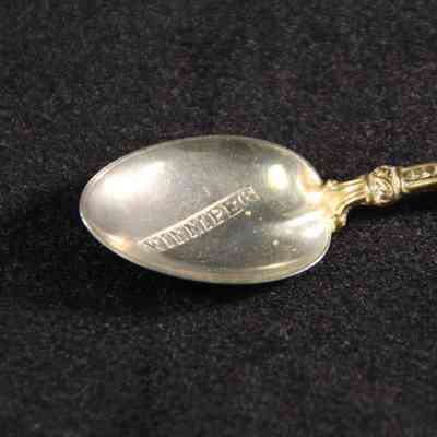 Souvenir spoon from Myrtle Mann collection. This spoon has "Winnipeg" in the bowl. The end has Maple leaves and the word "Canada". It is 4.0" long.