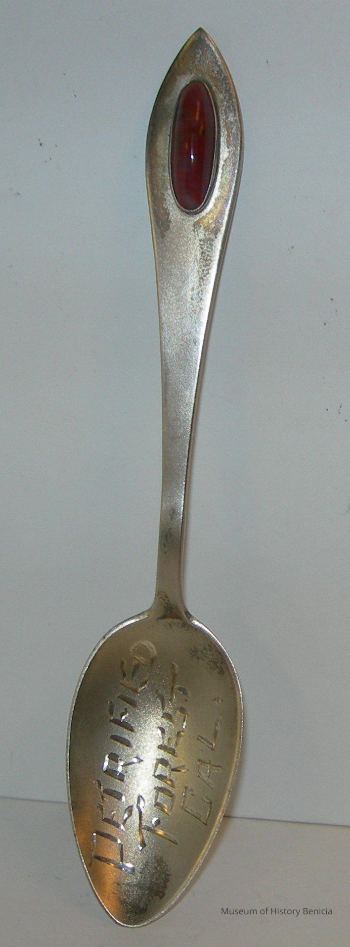 Souvenir spoon from Myrtle Mann collection. This spoon has a brown colored stone set in the handle. Probably petrified wood. The spoon says "Petrified Forrest Cal. It says "Sterling" on the back and has three metal proof mark letters.