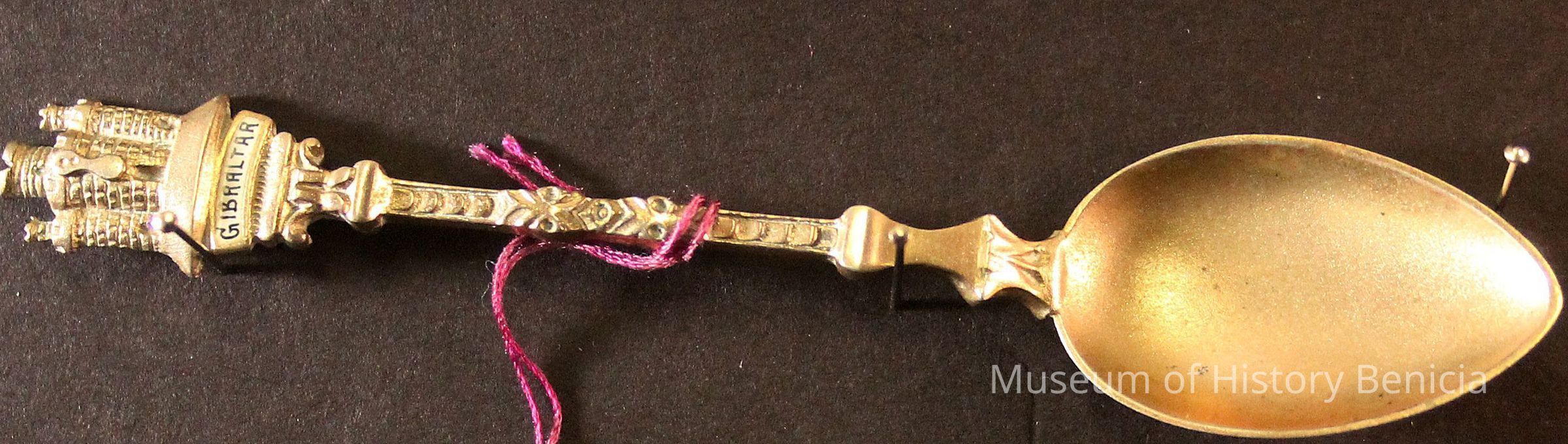 Souvenir spoon from Myrtle Mann collection. This spoon has the word "Gibralter" on the top of the handle with a fort. It is 3.75" long.