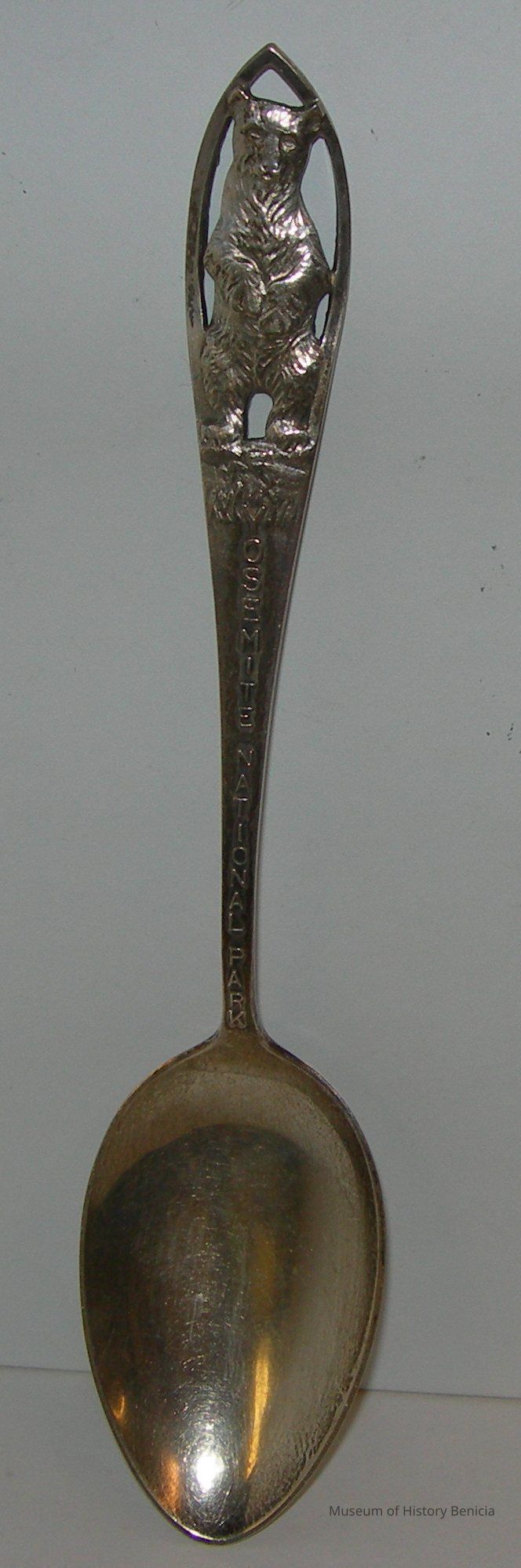 Souvenir spoon from Myrtle Mann collection. This spoon has a bear on the handle and the words "Yosemite National Park" along the handle. The back says "sterling" and has three metal pproof marks.