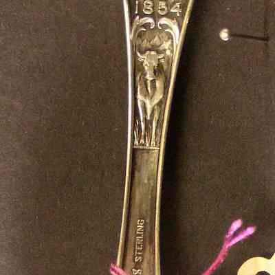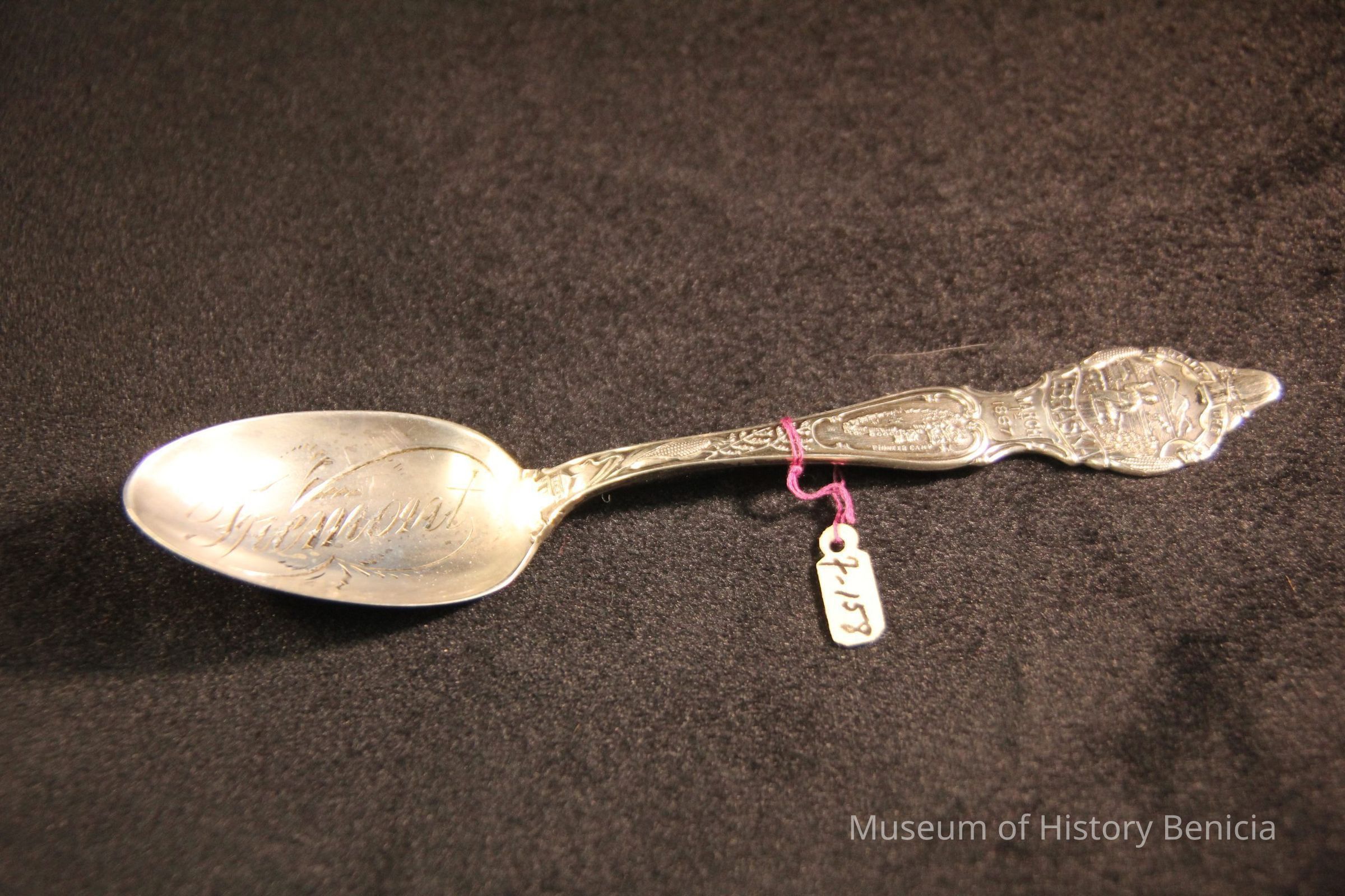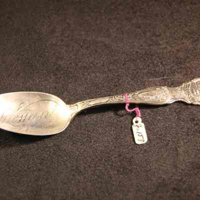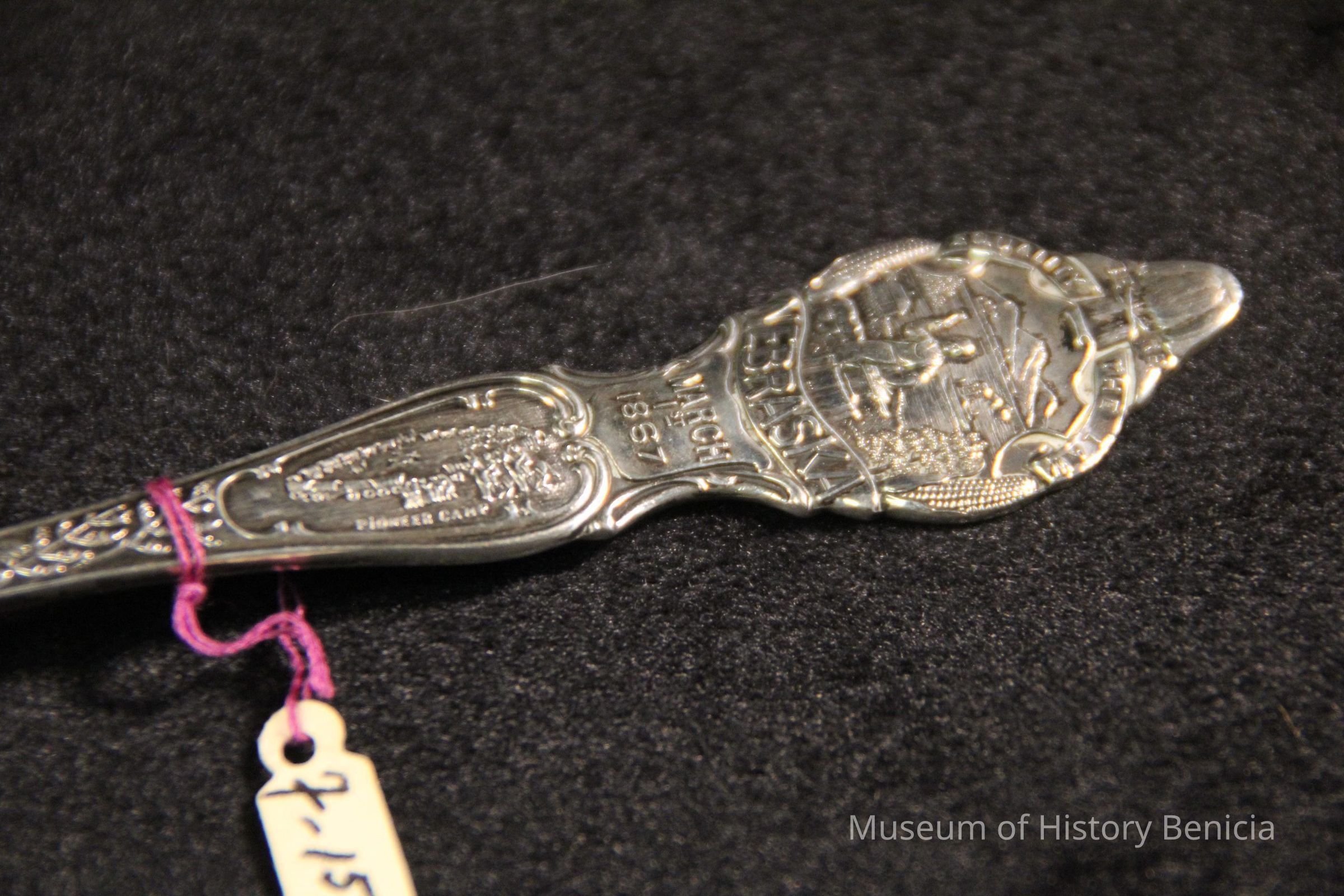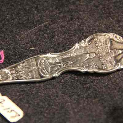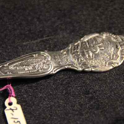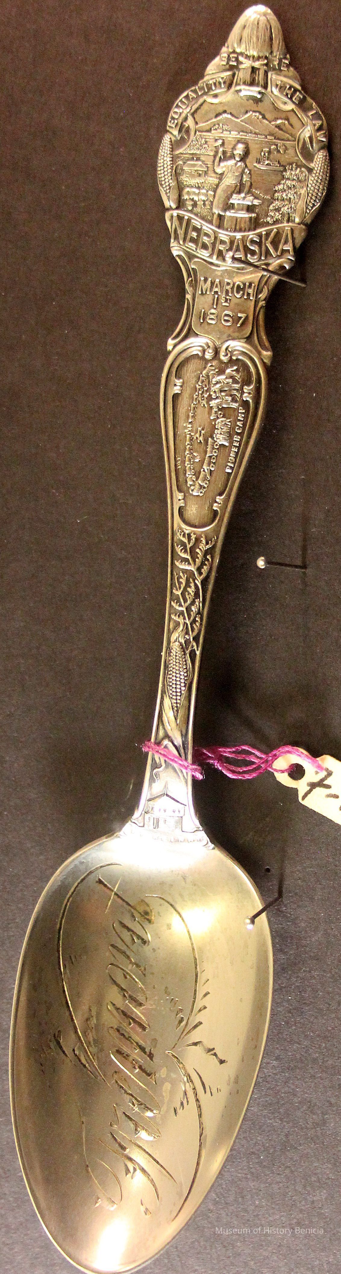 Souvenir spoon from Myrtle Mann collection. This spoon has the word "Nebraska March 1st 1867" on the handle and "Equality before the Law on top of the handle. The words "Fremont" in the bowl. There is a scene with ships, houses and a blacksmith also on the top of the handle. It is 6.0" long.