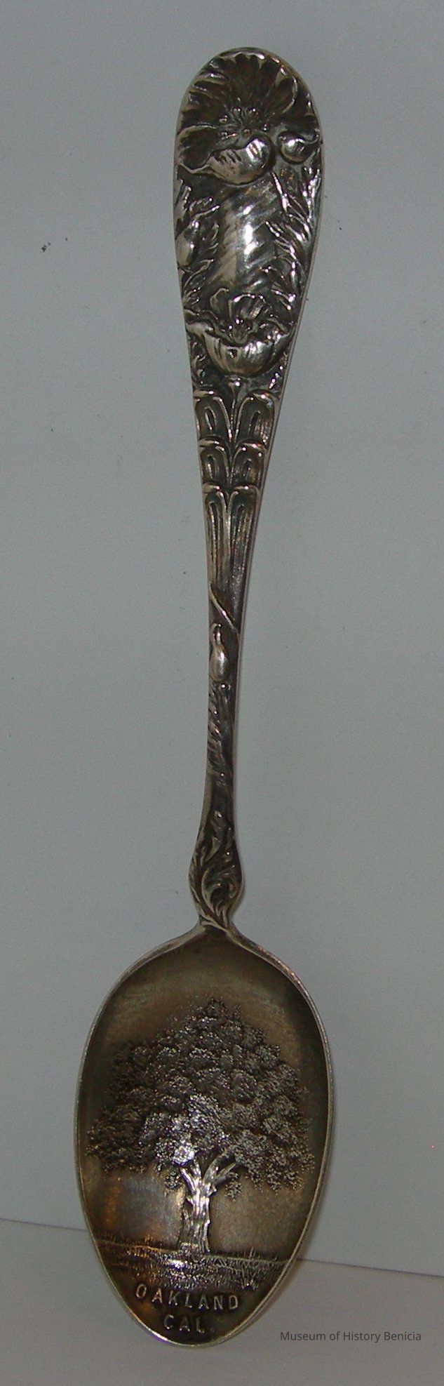 Souvenir spoon from Myrtle Mann collection. This spoon has flowers on the handle. The spoon shows an Oak tree and the words "Oakland Cal".