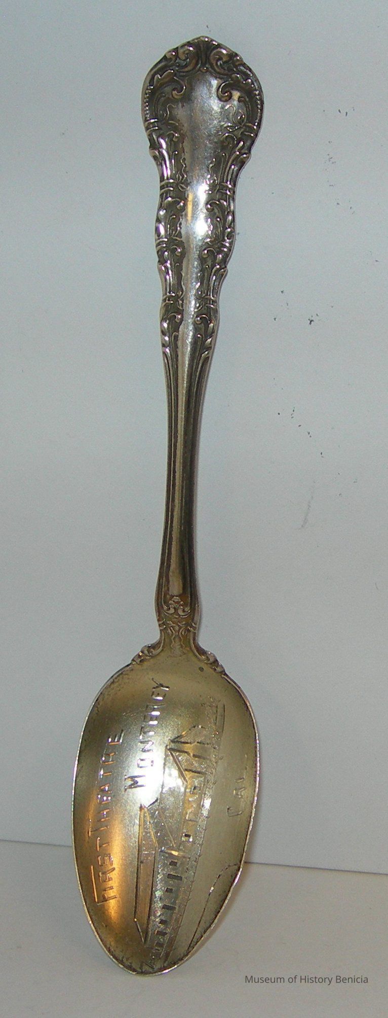 The spoon shows a building and says "First Theater Monterey Cal.